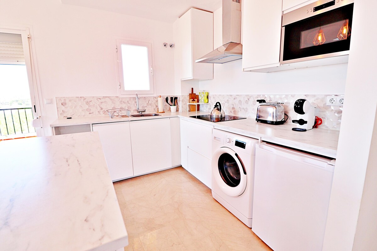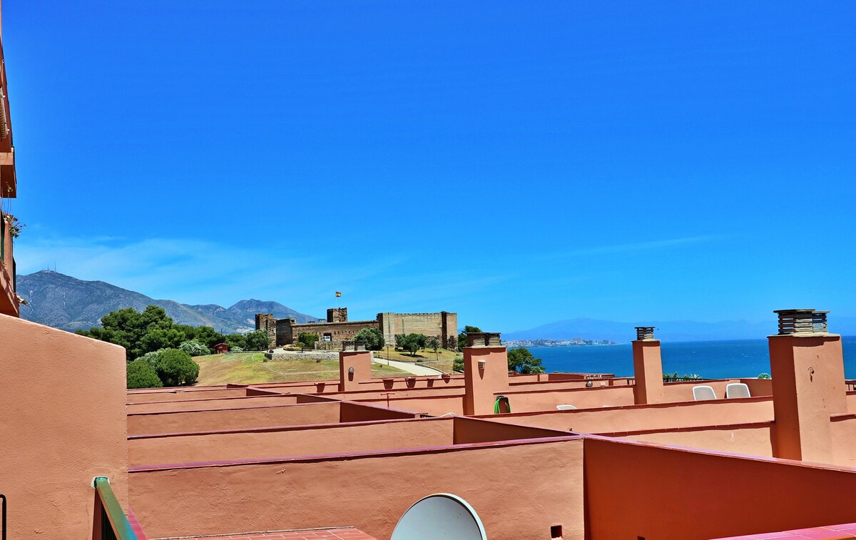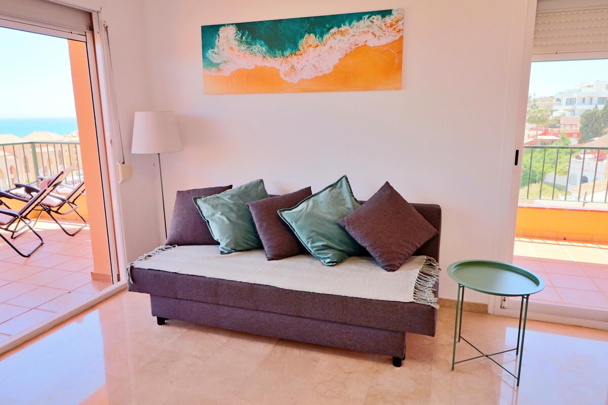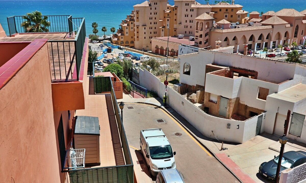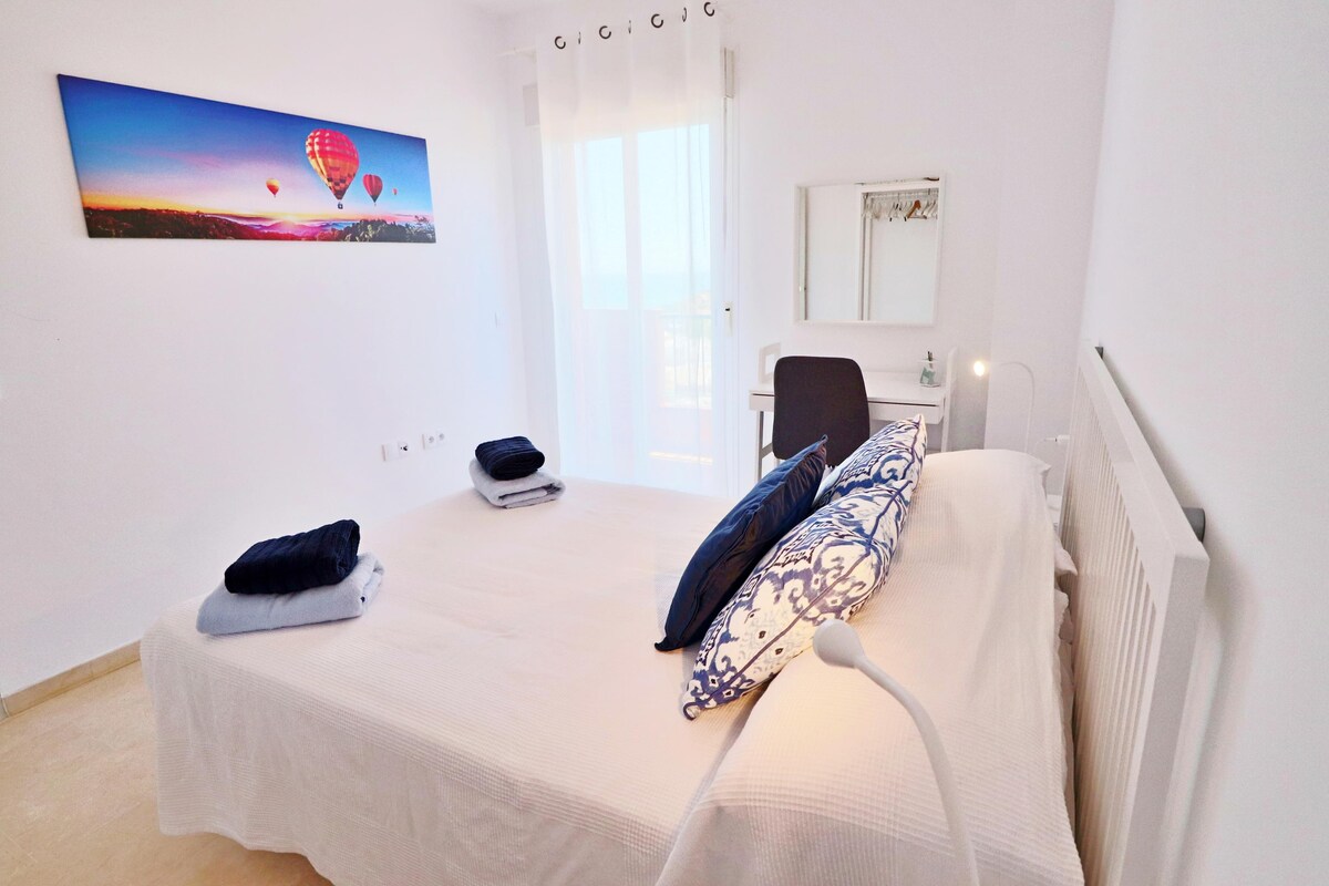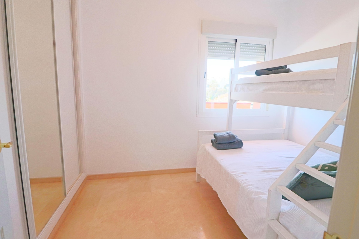 The apartment has a spacious lounge with sofa, armchair, TV and dining table seating 4 people. From the living room you reach the south facing terrace with stunning views of the sea and castle. The open plan kitchen is fully fitted with all appliances and utensils to cook. There are two bedrooms, one with a double bed and workstation desk. The other bedroom has large fitted wardrobe, bunk beds with a double bed on the bottom and single bed at the top. Modern bathroom with walk in shower. The apartment is well equipped with air conditioning in all rooms, free Wi-Fi, HD TV. There is a covered garage with parking space and a communal swimming pool and garden area.Other things to note