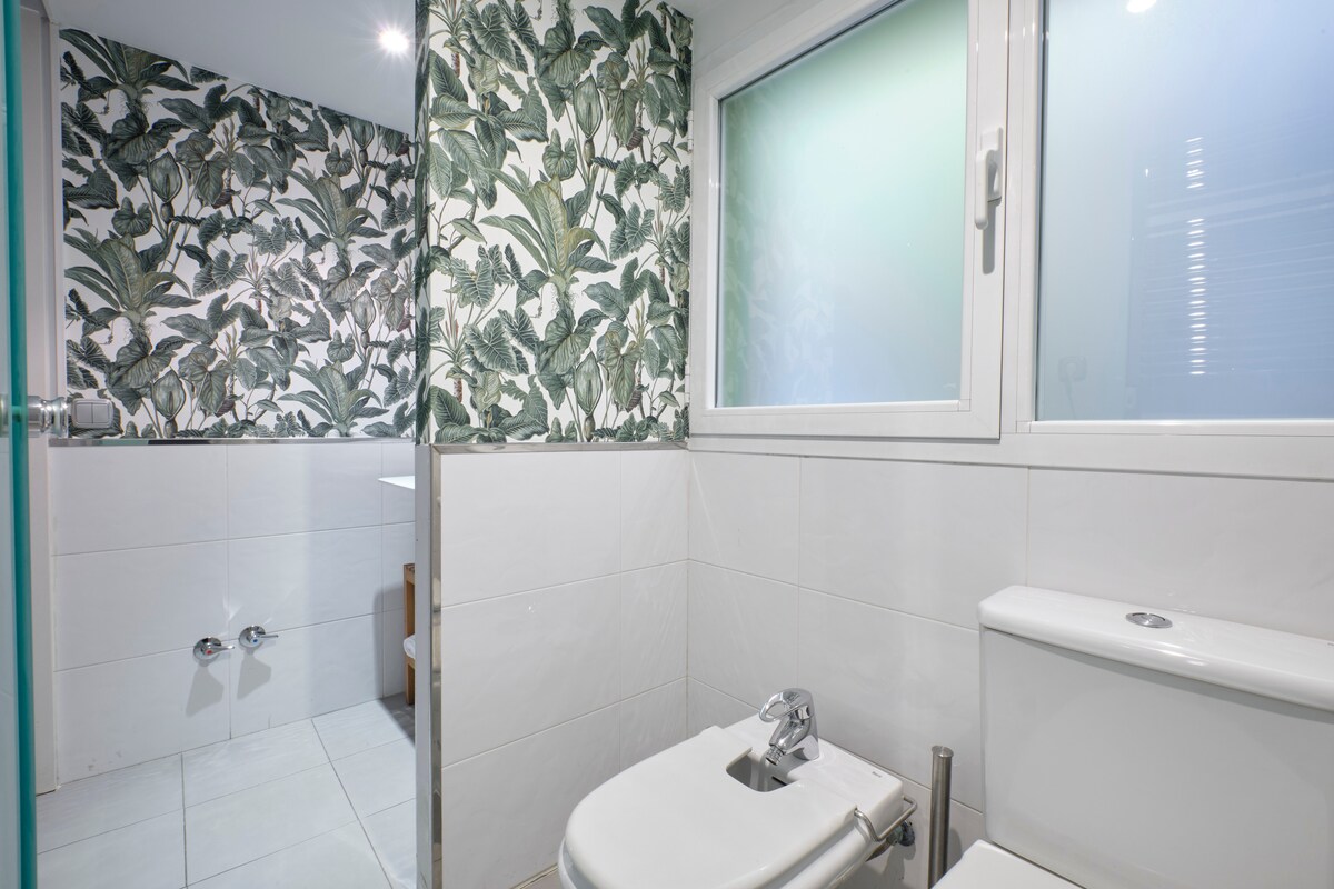 It has a bedroom with a double bed, another room with two singles and a third room also with two singles more , living room , two bathrooms and kitchen. Elevator.