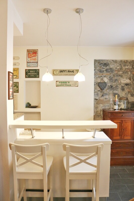 On the first floor, there is a fully equipped kitchen and a bar with stools for breakfast. There is also the dining area.