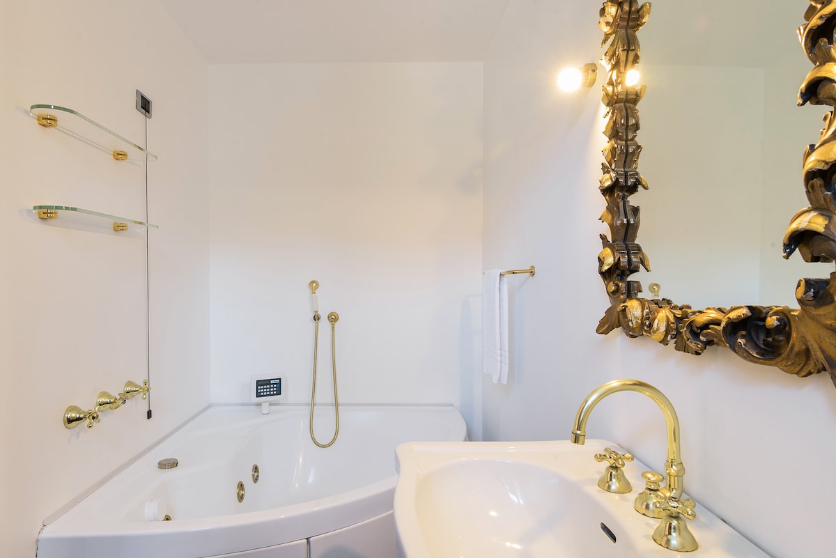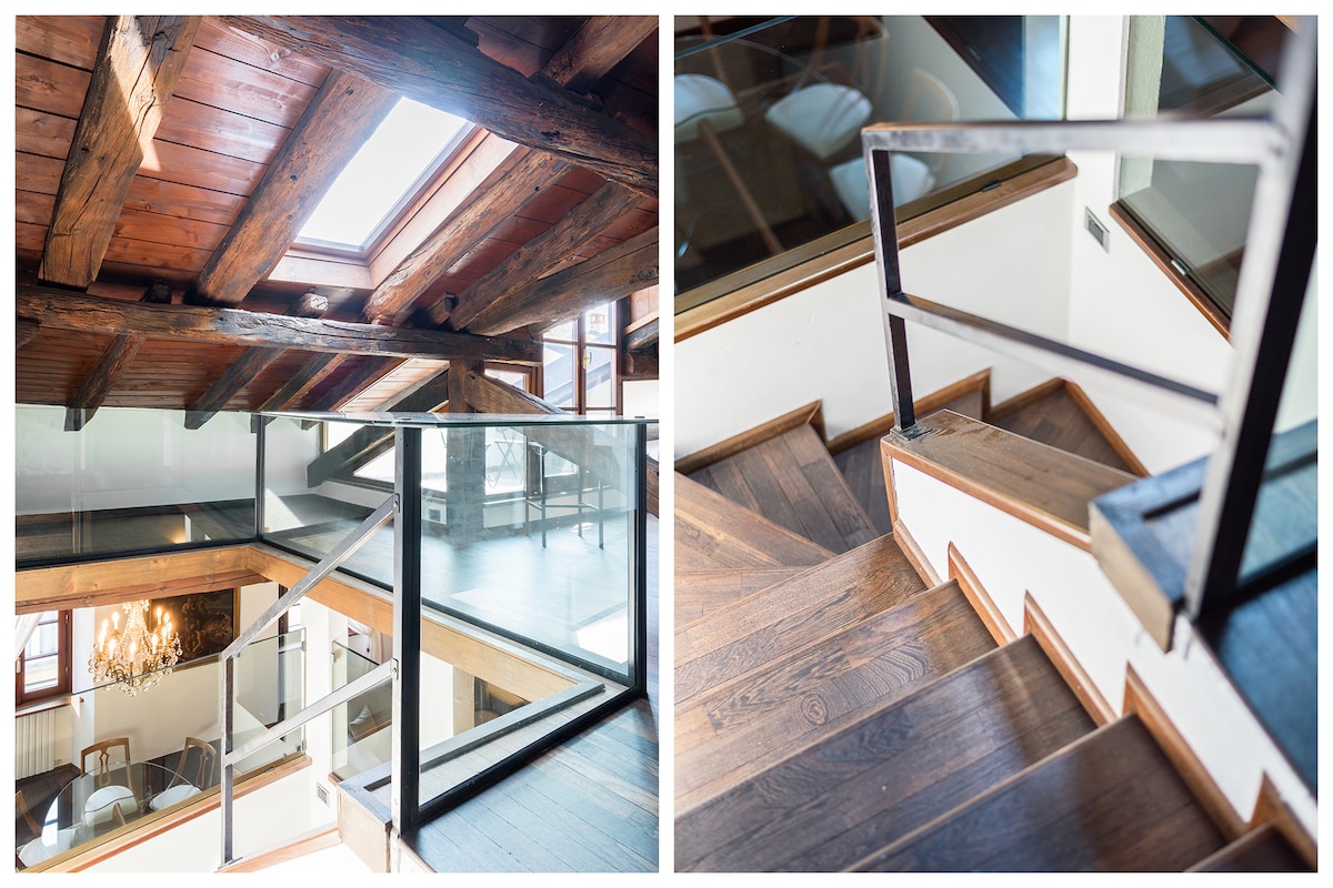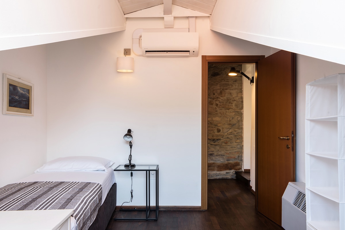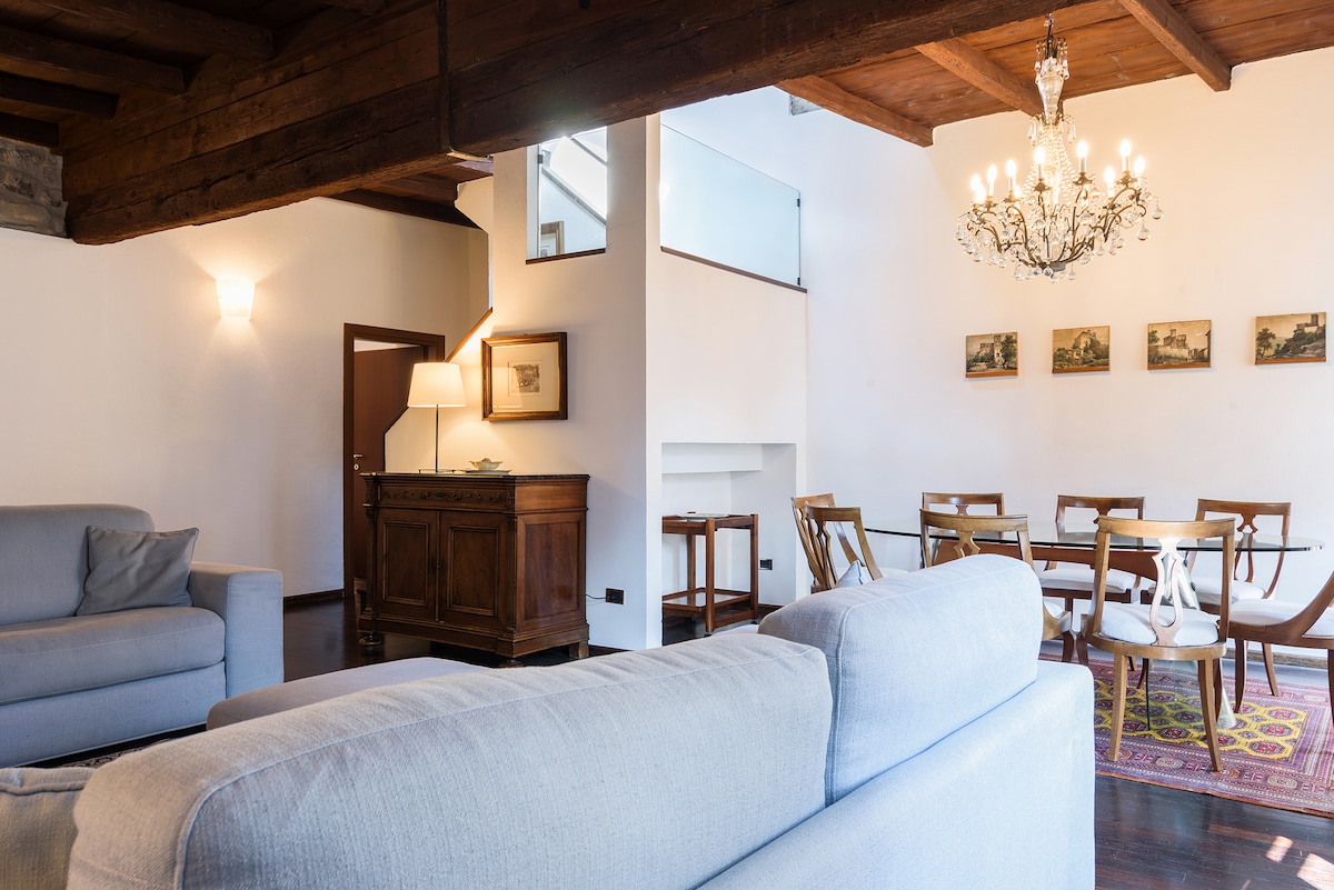 The attic apartment includes three bedrooms (one double bedroom and two bedrooms with twin beds), three bathrooms, a living room, and a fully equipped kitchen. Available to guests, there is also a study/relaxation area and a small terrace overlooking the city rooftops and the mountains.The living room has wood beam ceilings, comfortable sofas, a crystal dining table in the diner area, period paintings, and wooden furnishings.