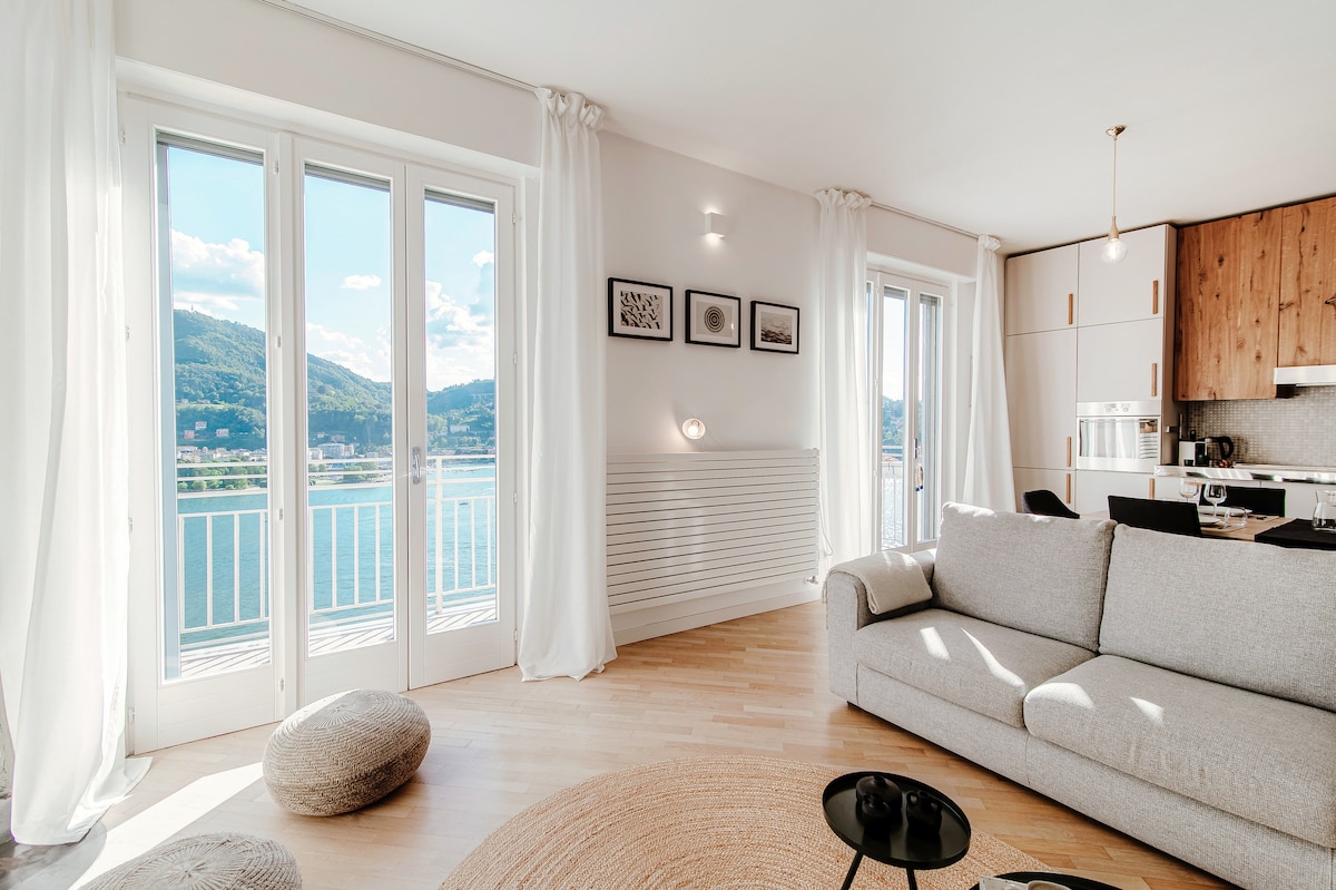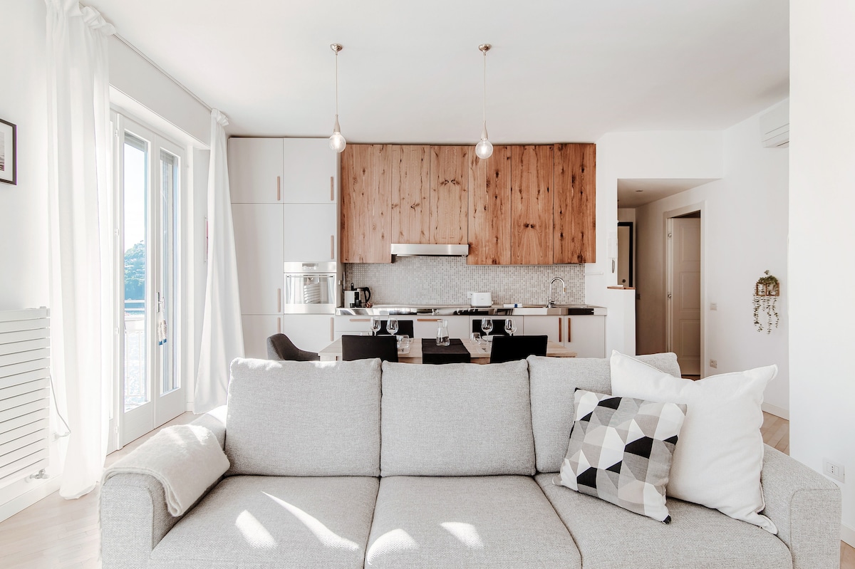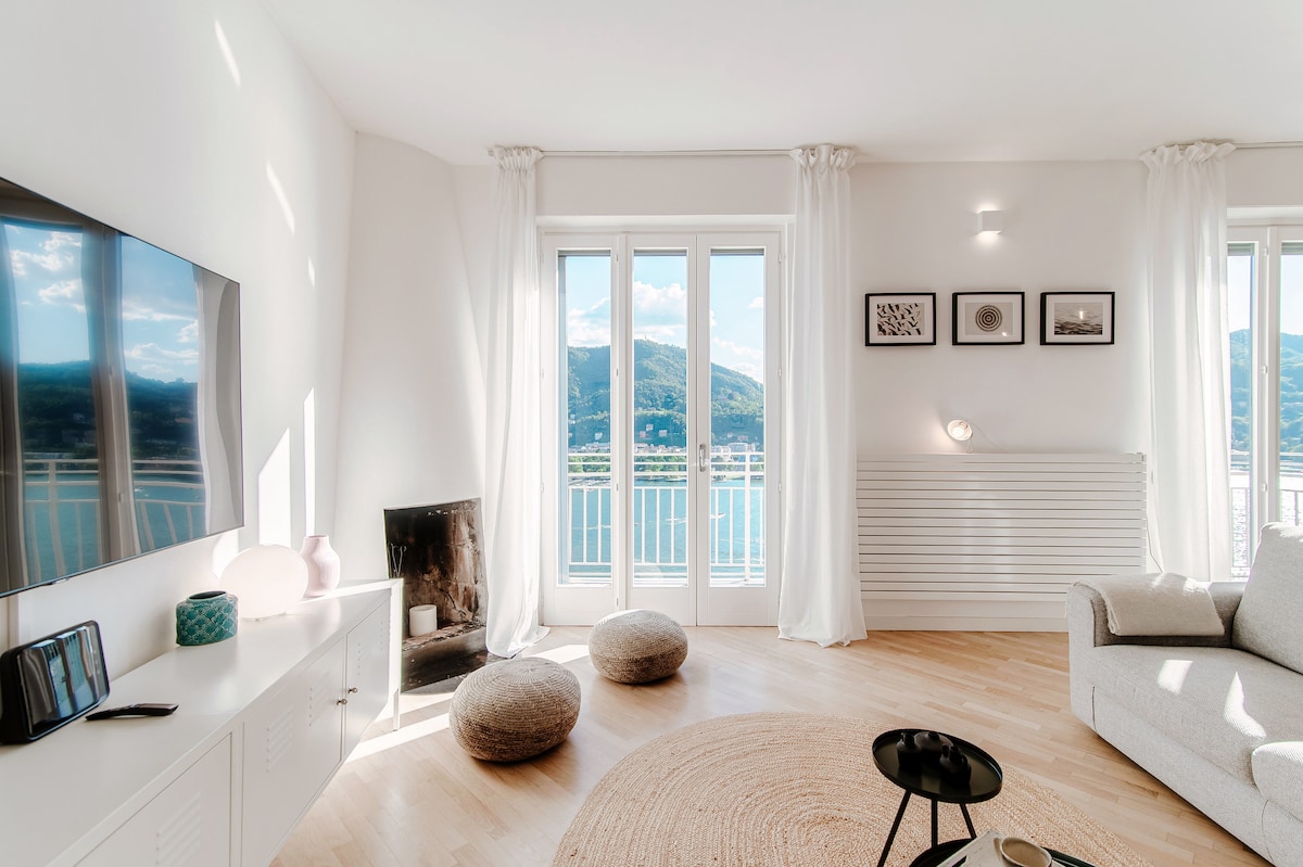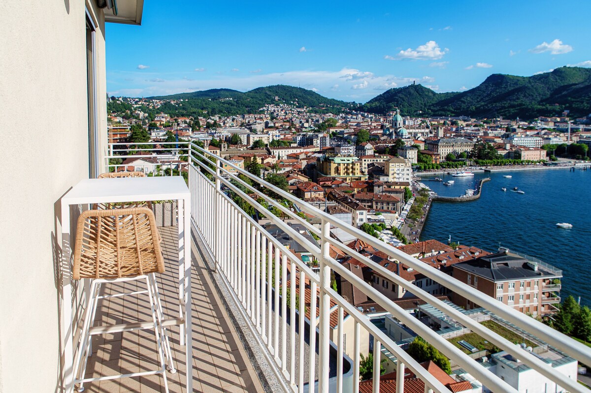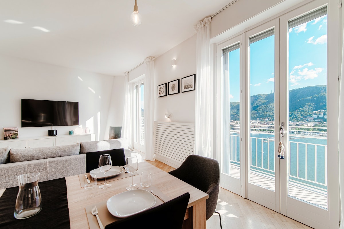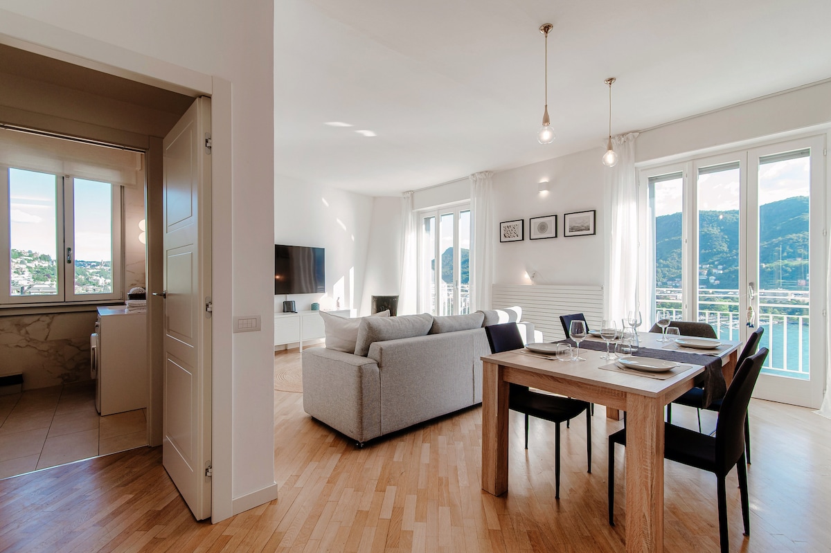 130 steps to enjoy great views of Lake Como and the surrounding mountains from a bright and modern 2-bedroom apartment with a balcony.