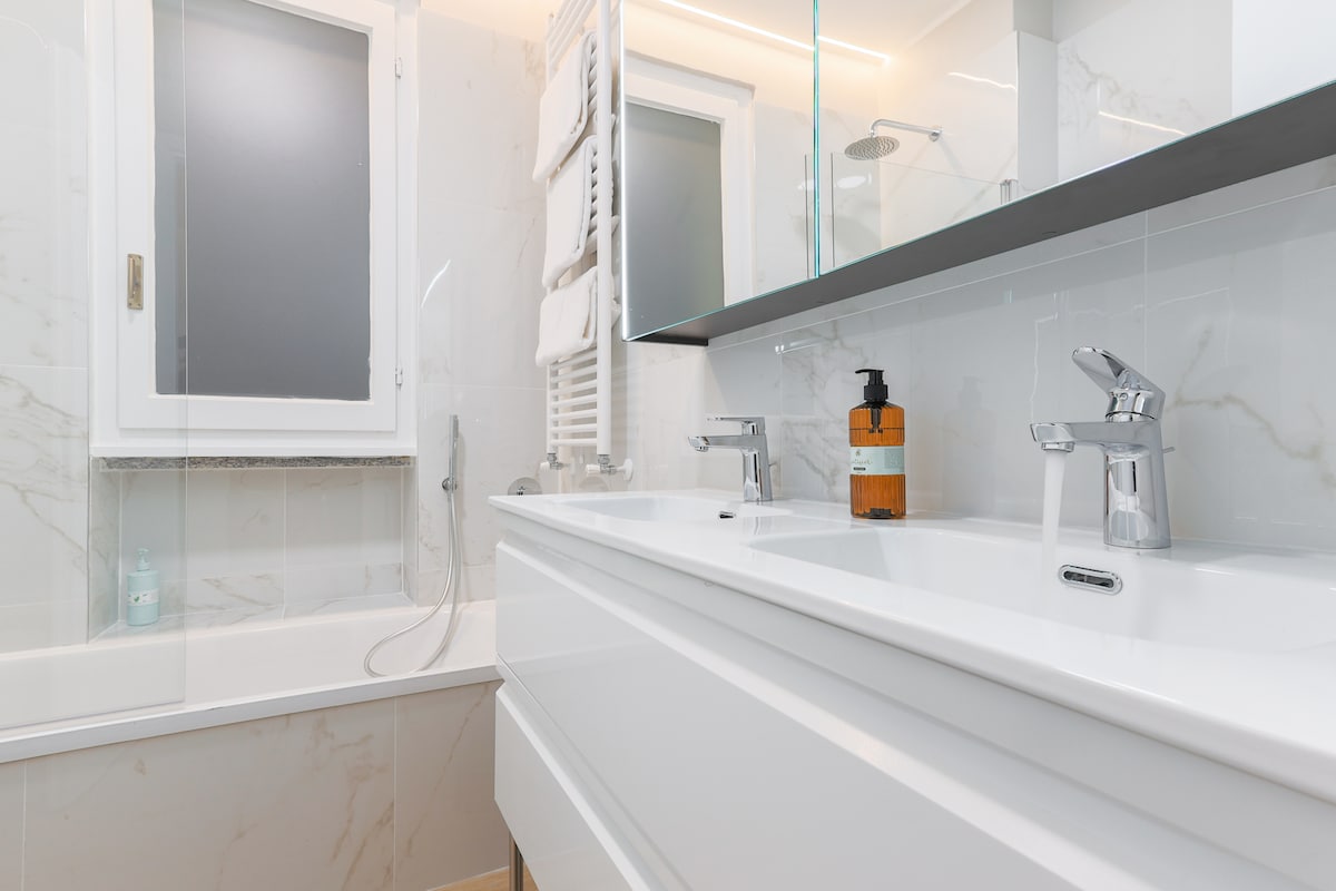 At the heart of the apartment's interior lies the "Great Room," an embodiment of classic elegance with a modern touch. Furnished with a queen-sized sleeper sofa, cozy armchairs, and a large smart TV, it is the perfect place to relax. Direct access to the terraces seamlessly blends indoor comfort with outdoor beauty.