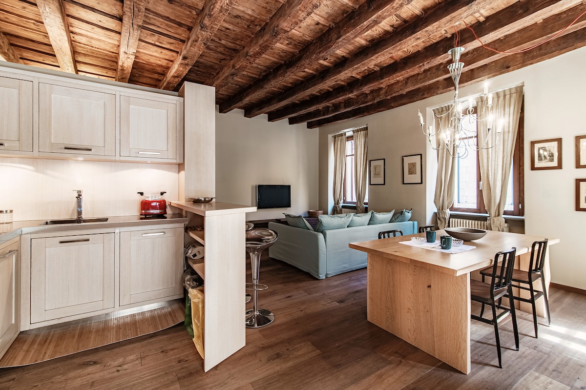 This bright and finely furnished apartment with exposed wooden beams is located in a historic city building, making it a great starting point for comfortably exploring the city centre.This apartment can accommodate up to 4 people, thanks to a double bedroom with a convenient walk-in closet, a living room with a comfortable sofa bed, a modern, fully equipped kitchen - induction stove, hood, dishwasher, etc., and a bathroom with a shower. The apartment also features air conditioning in the living room, a washer-dryer, and free wi-fi.