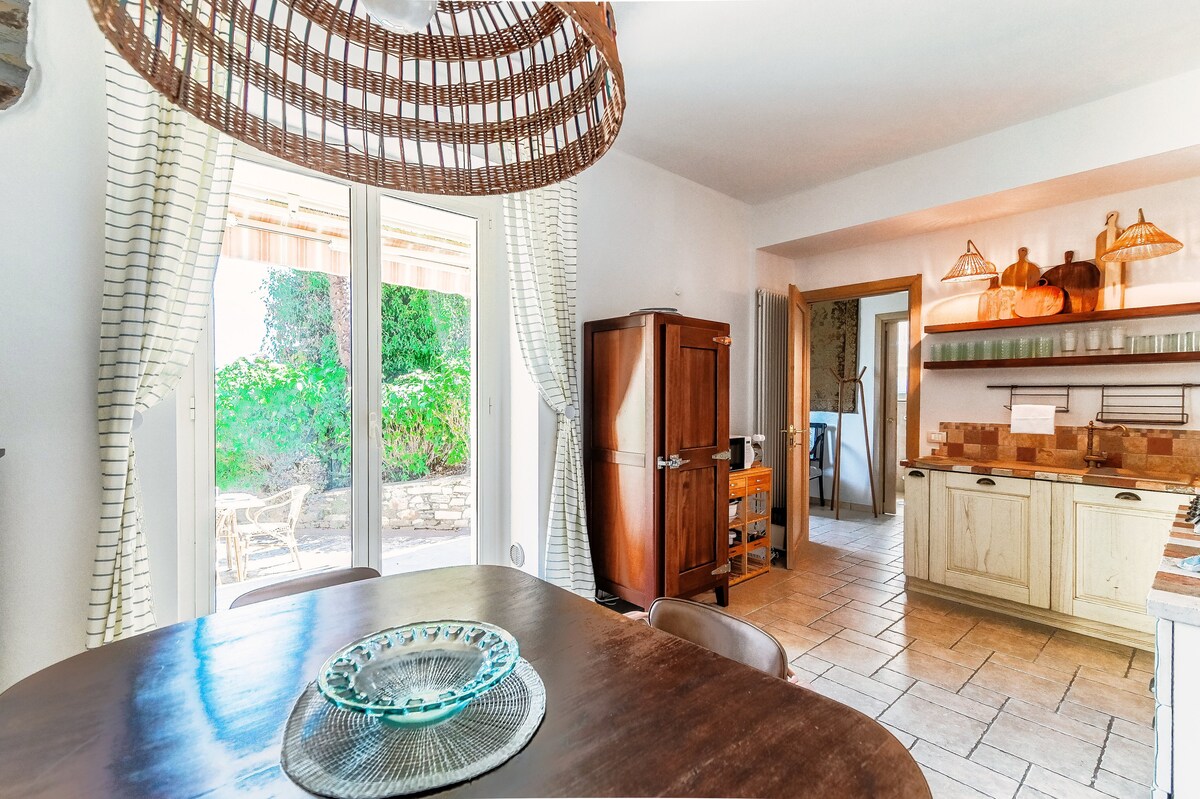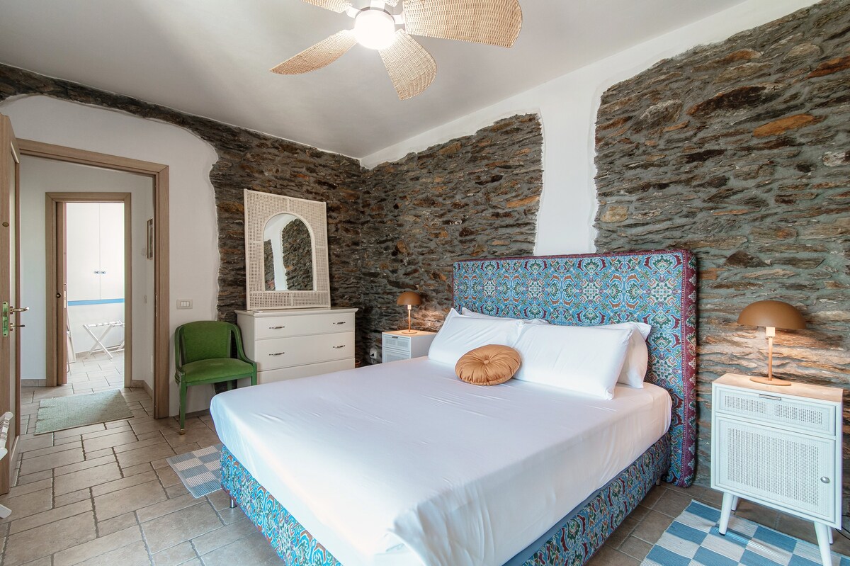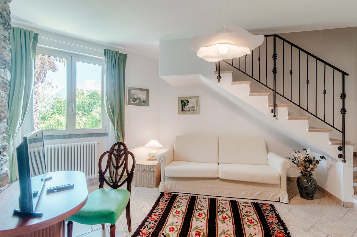 The décor, blending classic and rustic elements, harmonises well with the stone walls and white plaster, creating a cosy and occasionally exotic atmosphere with some wicker furniture. All of these details, along with the fabulous lake view and the garden's palm trees, will truly make you feel like you are in a corner of paradise where you can relax and find peace of mind.This apartment can comfortably accommodate up to five people, making it suitable for a family or a group of friends. There are two bedrooms, one with a double bed and another with a queen-size bed and a sofa bed. You will also find a spacious and modern kitchen equipped with all the appliances you will need, as well as two convenient bathrooms with showers. The apartment is also equipped with a washer-dryer and free wi-fi for added convenience. While the apartment does not have air conditioning, you can use portable fans and ceiling fans to cool the rooms. Additionally, you can use a retractable awning for shade and relaxation on the terrace.
