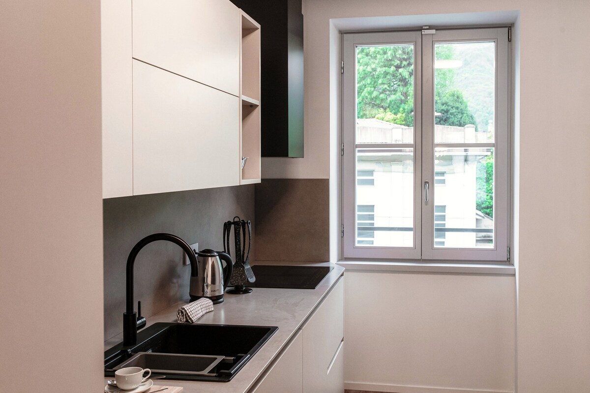 Marinetti Suite 8 is a spacious one-bedroom apartment located on the second floor of a recently renovated building, just outside the walled city, on the lively Viale Lecco. This bright apartment offers a cozy and modern space for a comfortable stay in the lively city of Como.