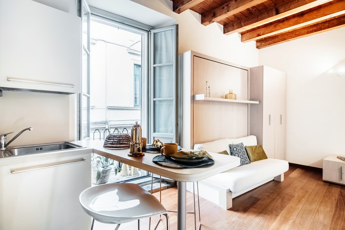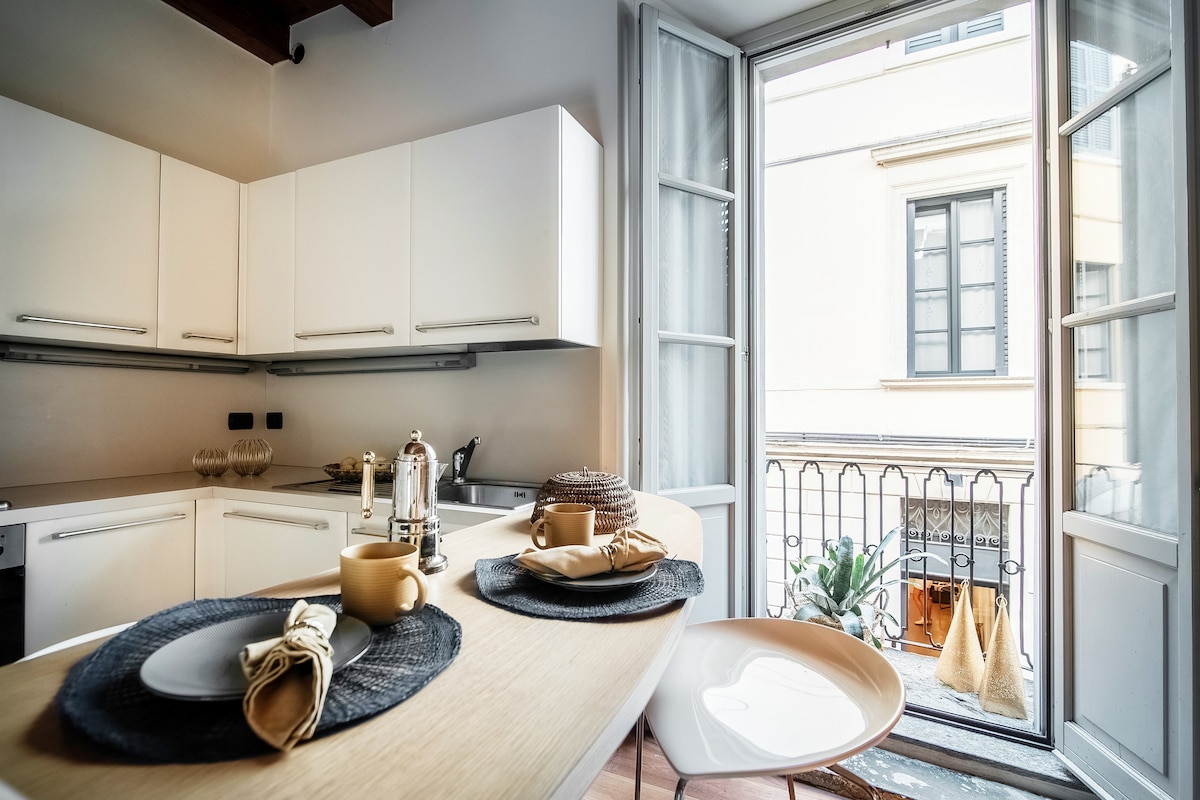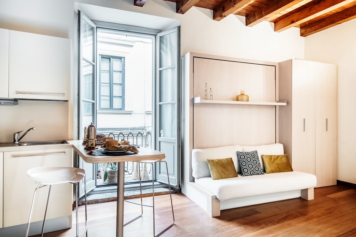 Escape to the charming and welcoming 'Del Pero Suite' to experience a true Italian getaway in the historic center of the city of Como. The studio can accommodate 2 people. It features a comfortable fold-out double bed. The kitchenette is fully equipped with a stove, oven, toaster, Nespresso machine, dishwasher, refrigerator, iron, and ironing board. The smart TV and the workspace with WIFI ensure entertainment and, if needed, the possibility to work during your stay. The small balcony offers a view of Via Del Pero.Guest access