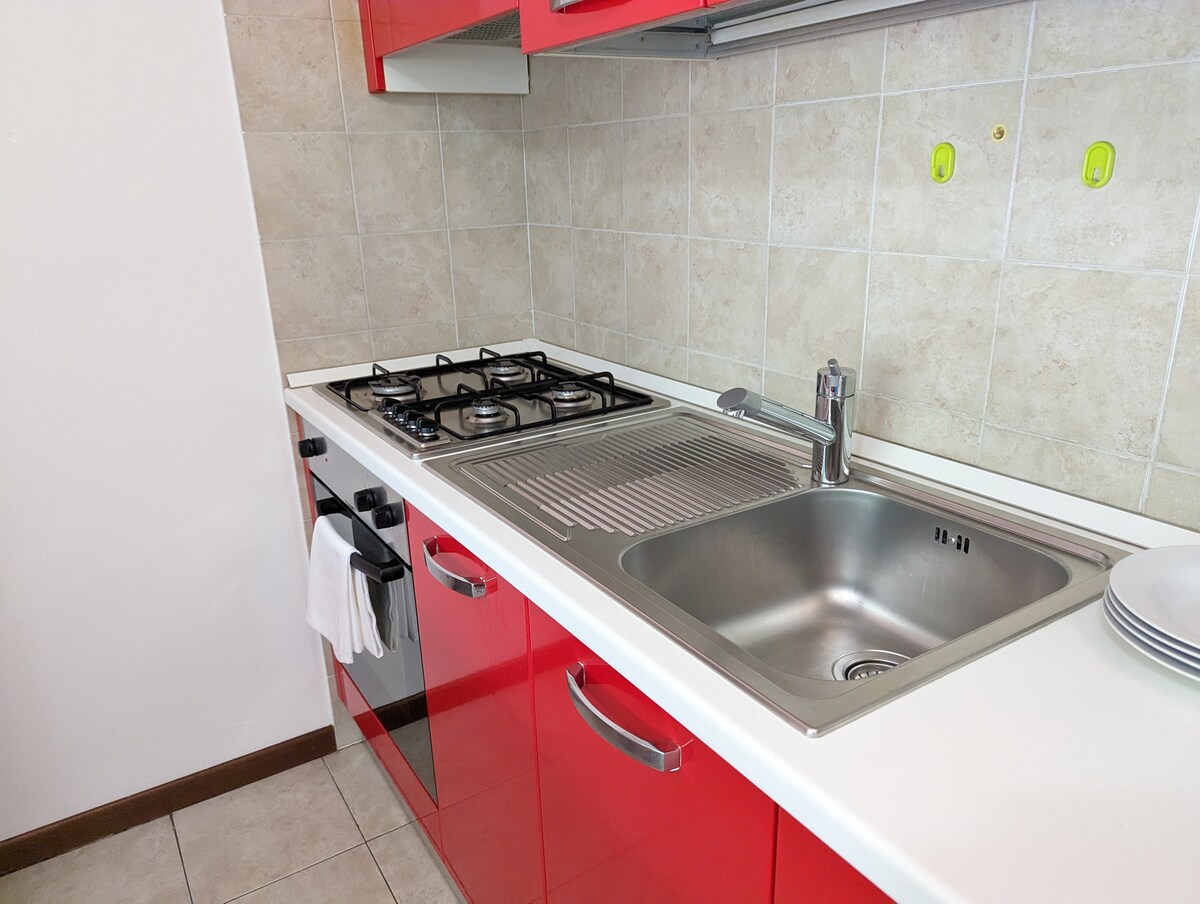 The flat is ideal for a couple but can accommodate up to 4 guests. There are a double bedroom with a large wardrobe, an open space incluging living room and kitchenette. The former features a sofa bed, a table with chairs and a flat TV screen. The latter features a nice and functional furniture in red colour and is equipped with all appliances you need – toaster, kettle, coffee machine, microwave oven, oven, fridge, gas stove, dishwasher, etc. There is a bathroom with washing mashing and tub with shower.For your comfort there are free WIFI and other appliances such as hairdryer, hoover, iron, etc. Electric shutters and air conditioning will allow you to keep the flat cool even when it is scorching outside.