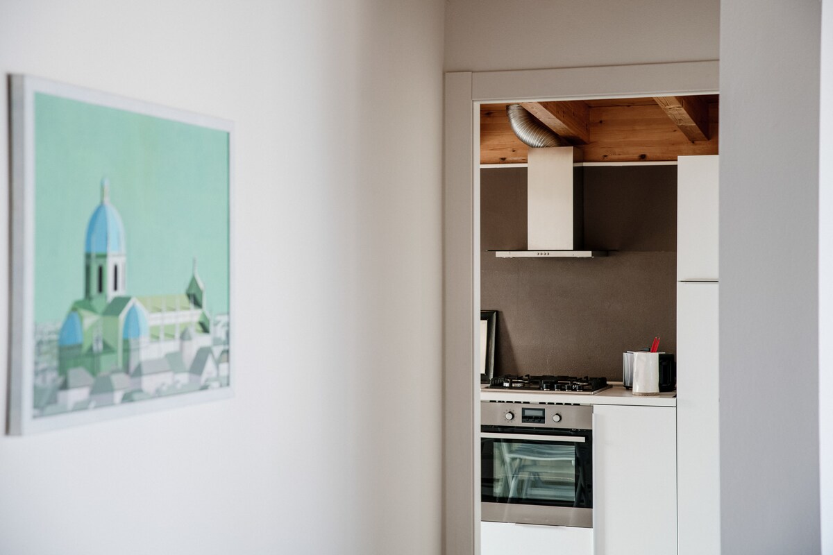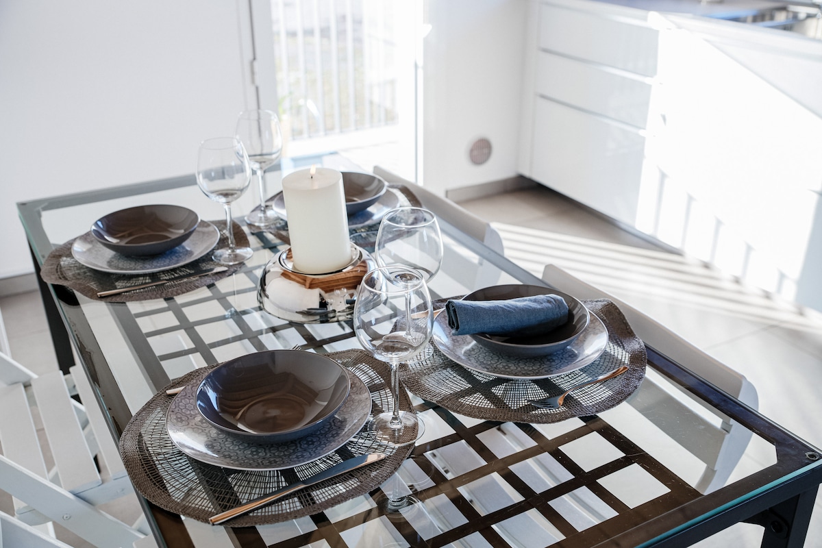 The two rooms can accommodate up to 4 guests: a double bedroom with an extra single bed that also acts as a sofa, and a private bathroom. The second room is equipped with a comfortable single bed, and the second bathroom has a bathtub. The living area is rich in natural light thanks to the large windows and perfectly organized with a double sofa, a bookcase, and a 50-inch flat-screen TV. The large window door overlooks the outdoor terrace from which you can enjoy city views. The kitchen is perfectly stocked, with simple and linear blocks that focus on modern design for both finish and color – an ideal ally for delicious dinners, perhaps with a home chef!Guest access