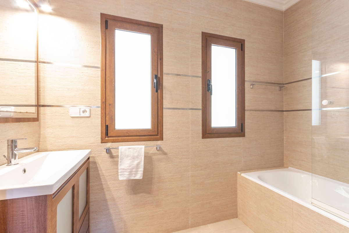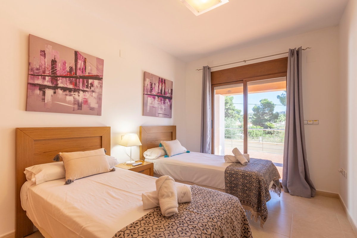 Both the second and third bedrooms are also conveniently situated on the main level. The second bedroom has a double bed, while the third bedroom features two twins. Both rooms also have access to the terrace and a shared guest toilet.