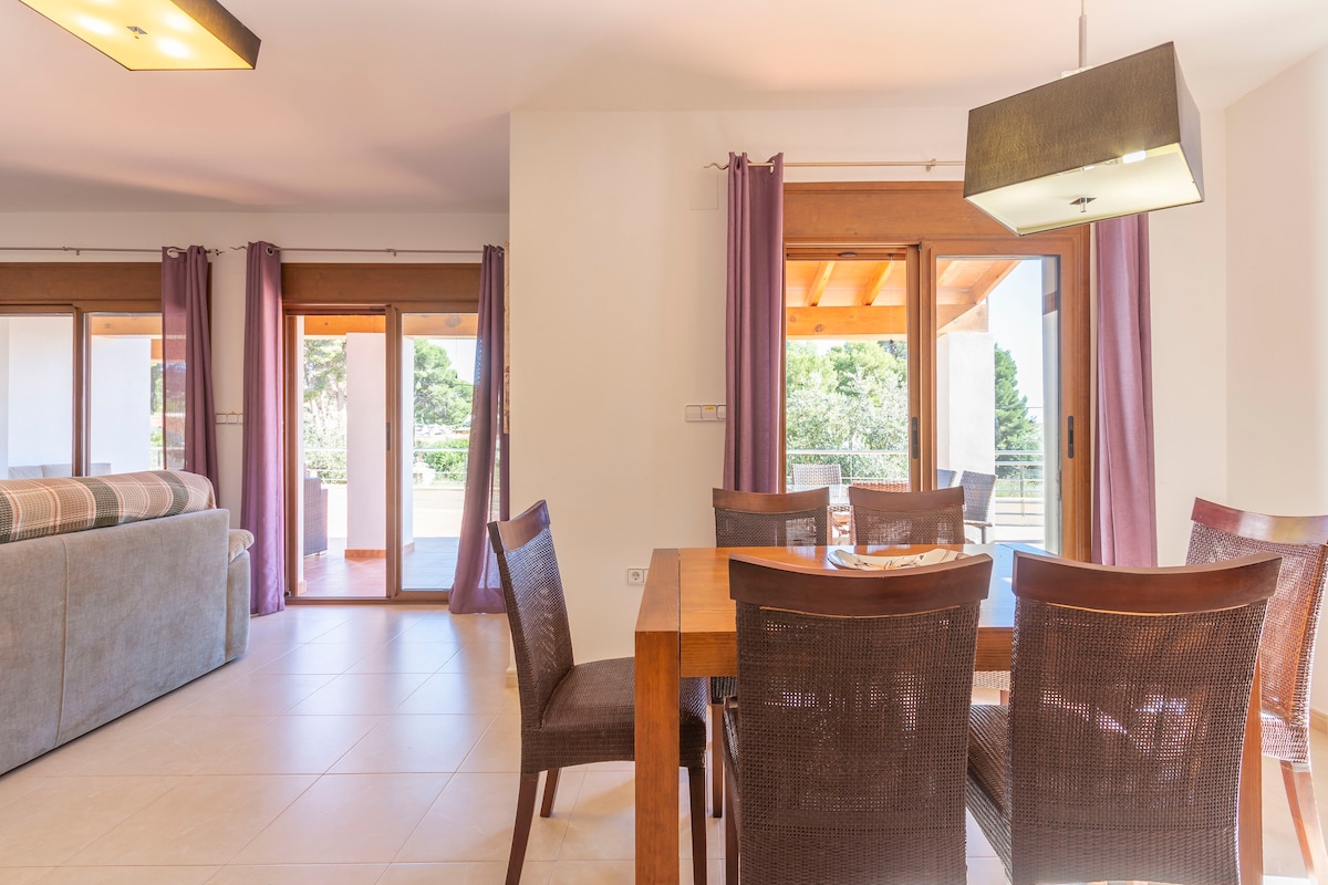 Natural light pours into a contemporary living area, furnished with charcoal grey sofas and a flat-screen TV. Steps away, a dining area with a light wood table offers room for six to share light lunches and generous evening meals.
