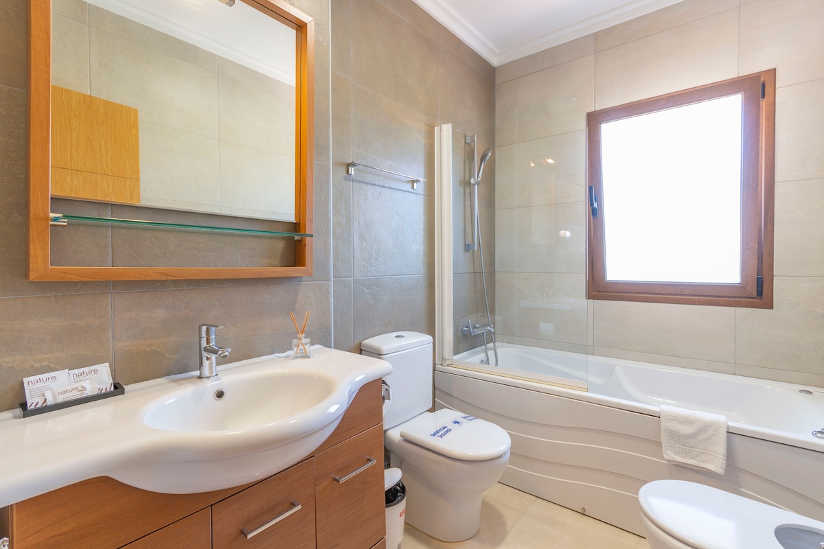Pick of the bedrooms is the master. Located on the upper level, this room has its own en-suite with a hydro-massage bathtub. The other big bonus of this room? Beautiful views overlooking the surrounding vineyards and Mediterranean sea.