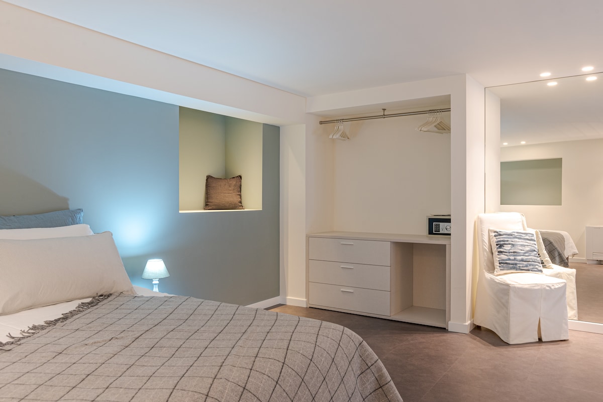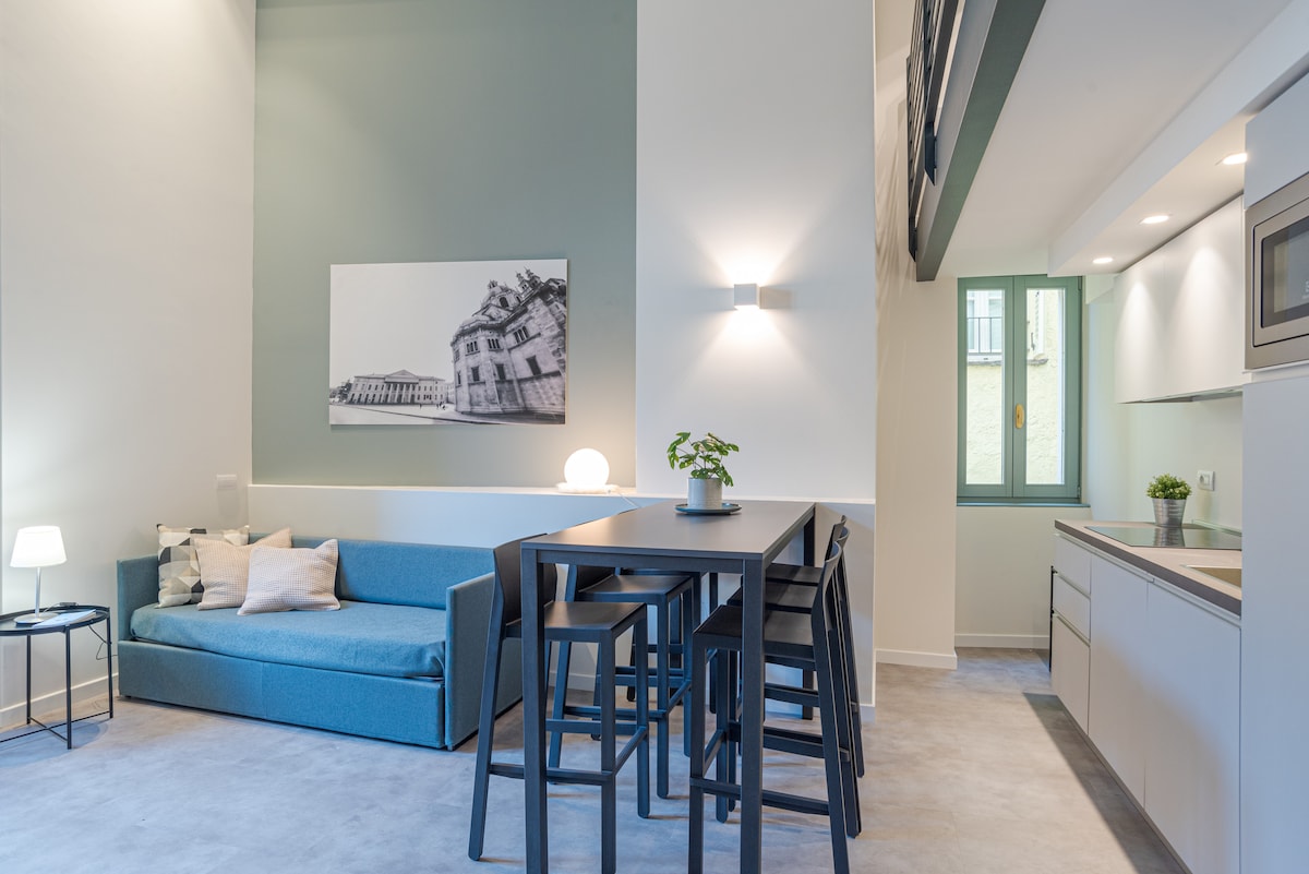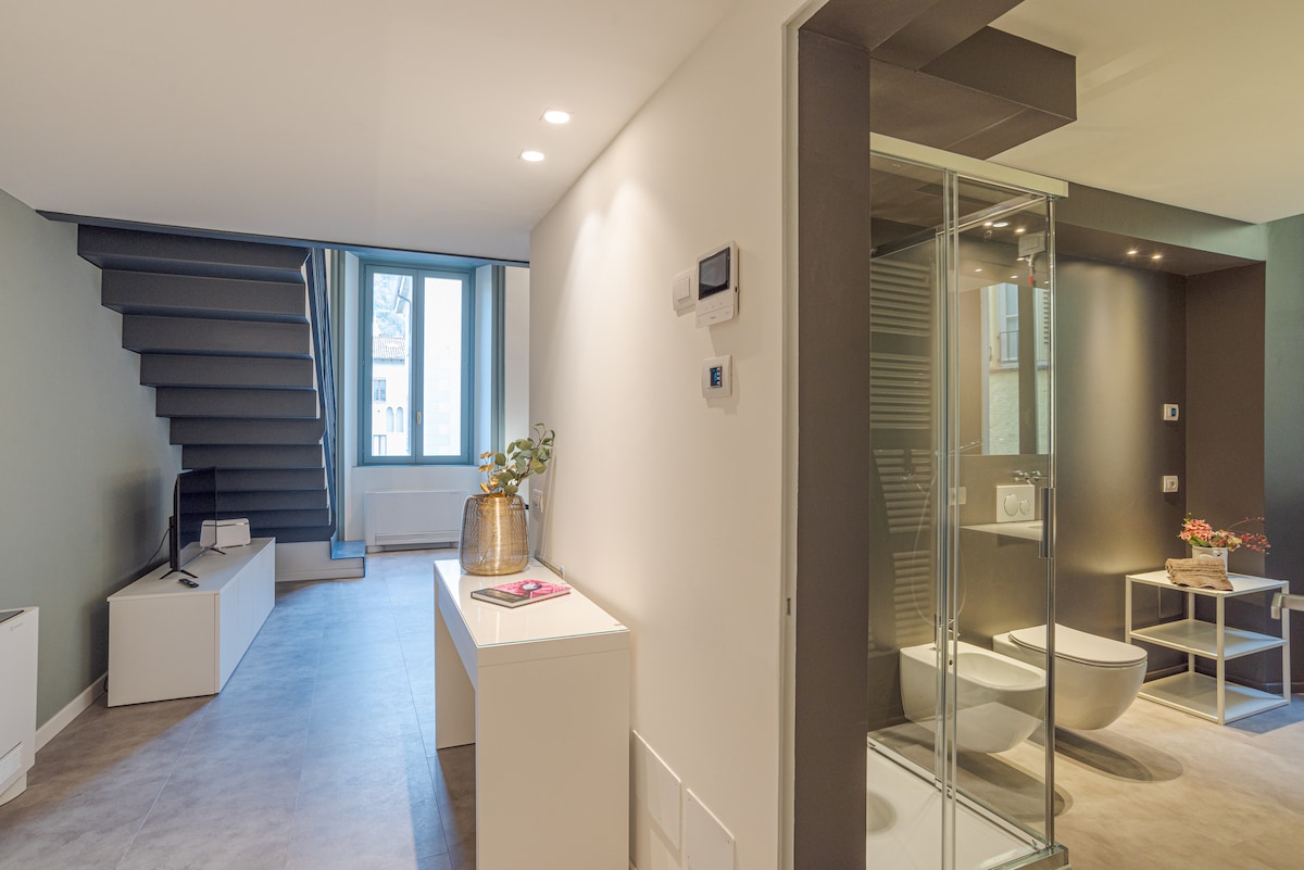 The Suite can host 4 guests. There is a loft bedroom with a double bed and a sofa bed in the downstairs living area.If larger groups of people wish to spend time in Como city together, Suite Funicolare can be connected with Suite Tigli through the opening of a door.
