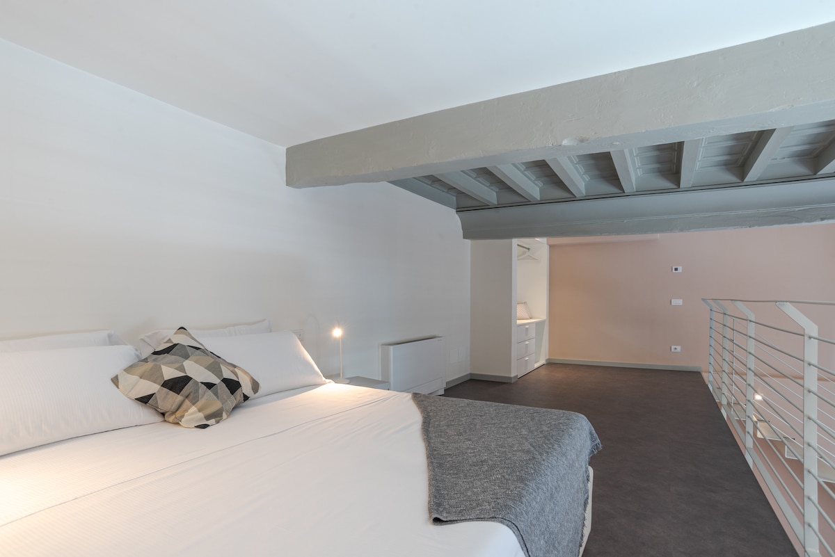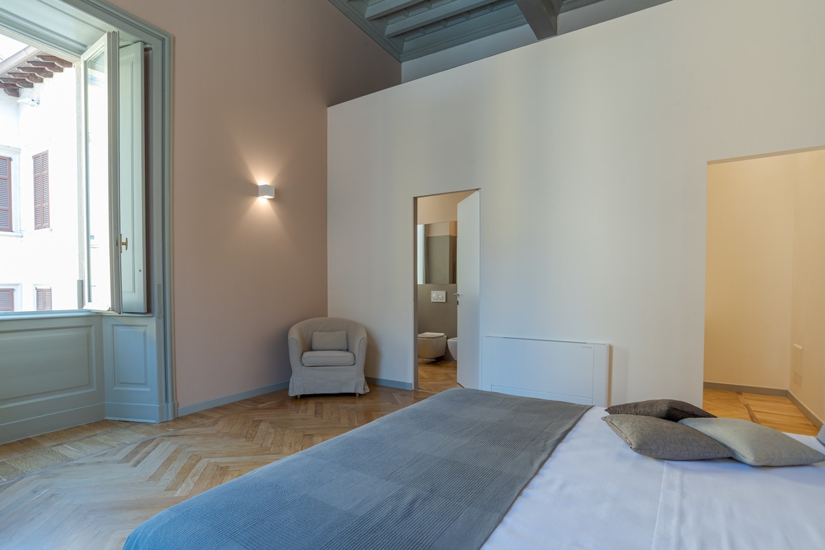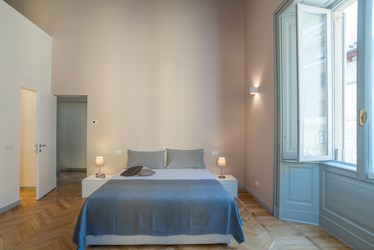 With a noble and recent refinement, the spaces in Palazzo Visconti masterfully combine majestic classicism with clean and cozy modernity. Warm colors and minimalist decor go a long way!“Cardinal Suite” can accommodate up to 6 guests. There are two bedrooms with double beds and a sofa bed in the living area which is shared with an equipped kitchenette. Two bathrooms. The apartment is two-leveled with one bedroom in the loft. There is a balcony overlooking Piazza Grimoldi.