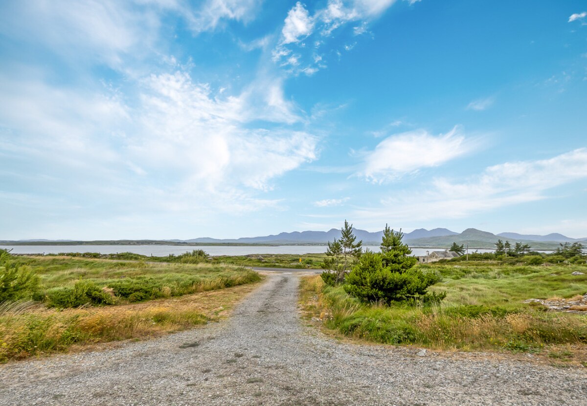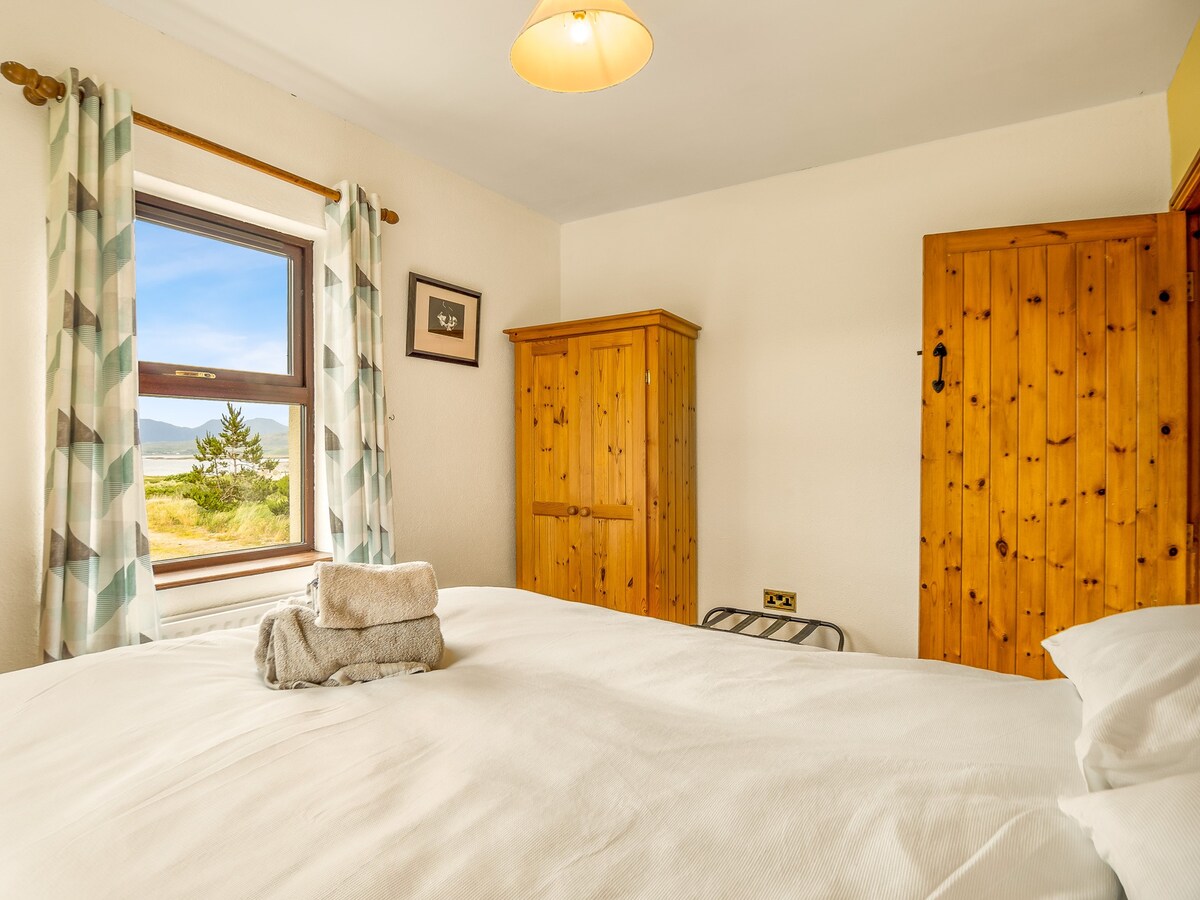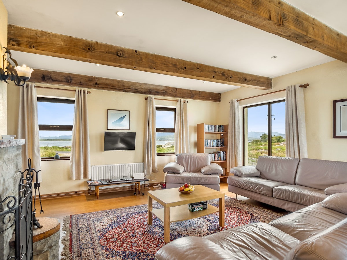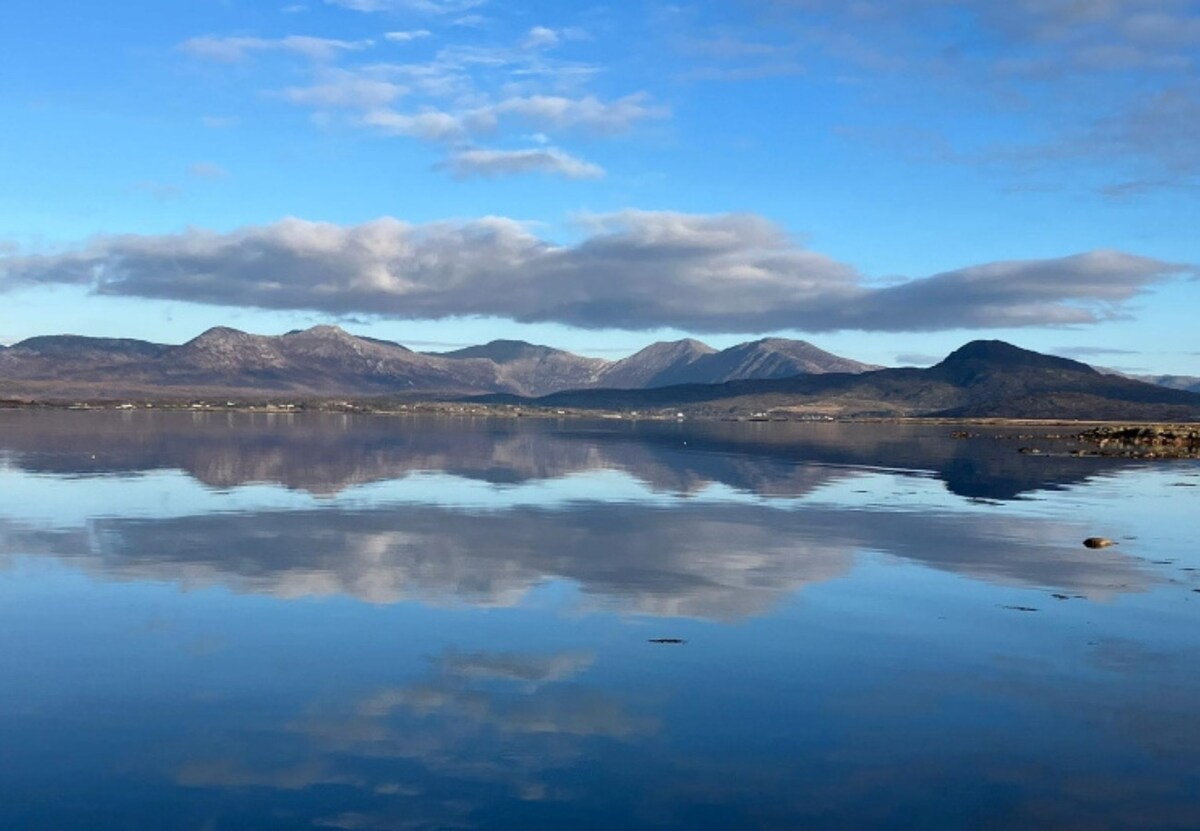 Facing west (glorious sunsets) you can see Roundstone, six of the Twelve Bens and Cashel Hill as well as many other mountains. Bertraghboy Bay lies between the cottage and the mountains and provides an ever-changing vista.