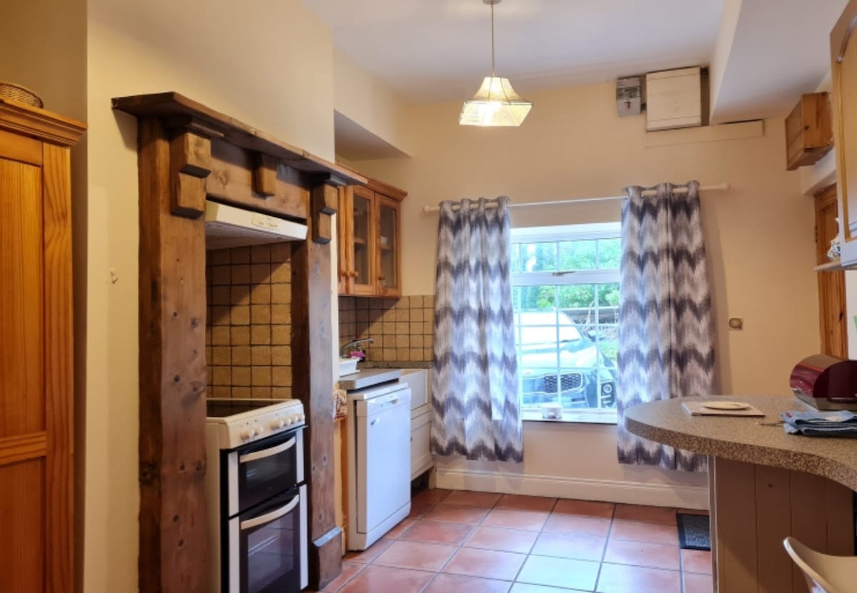 The kitchen is fully equipped with an oven, fridge, and microwave and from here, there is a utility room with a separate washing machine and dryer.