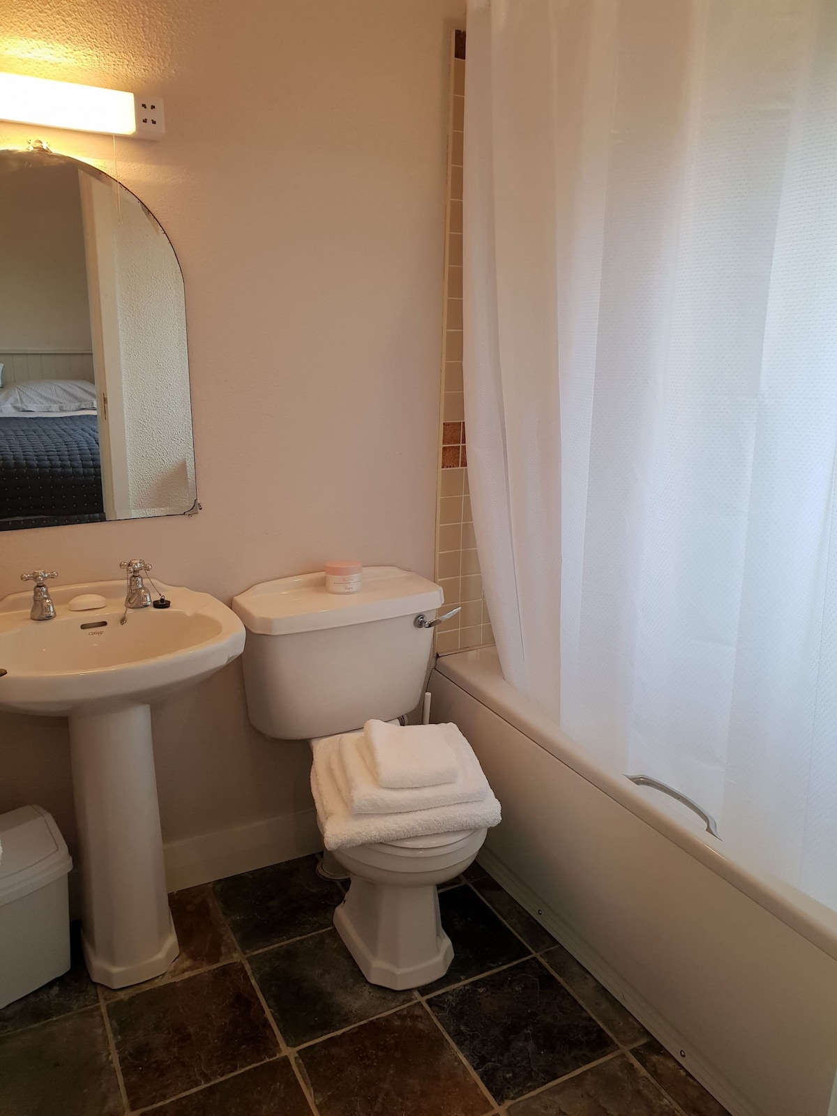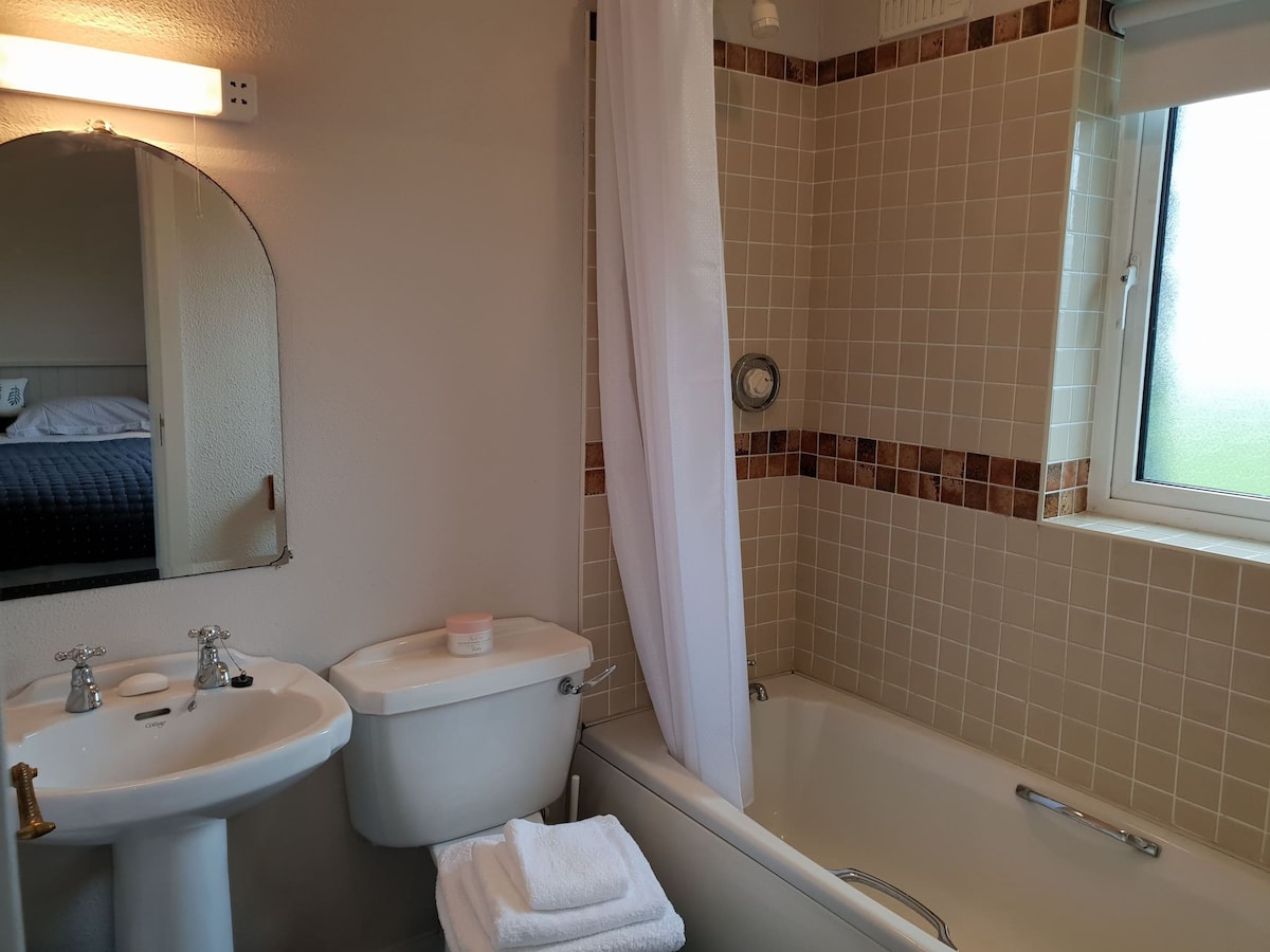 Ensuite bathroom comprising of a bath with shower overhead, Wc & sink unit.