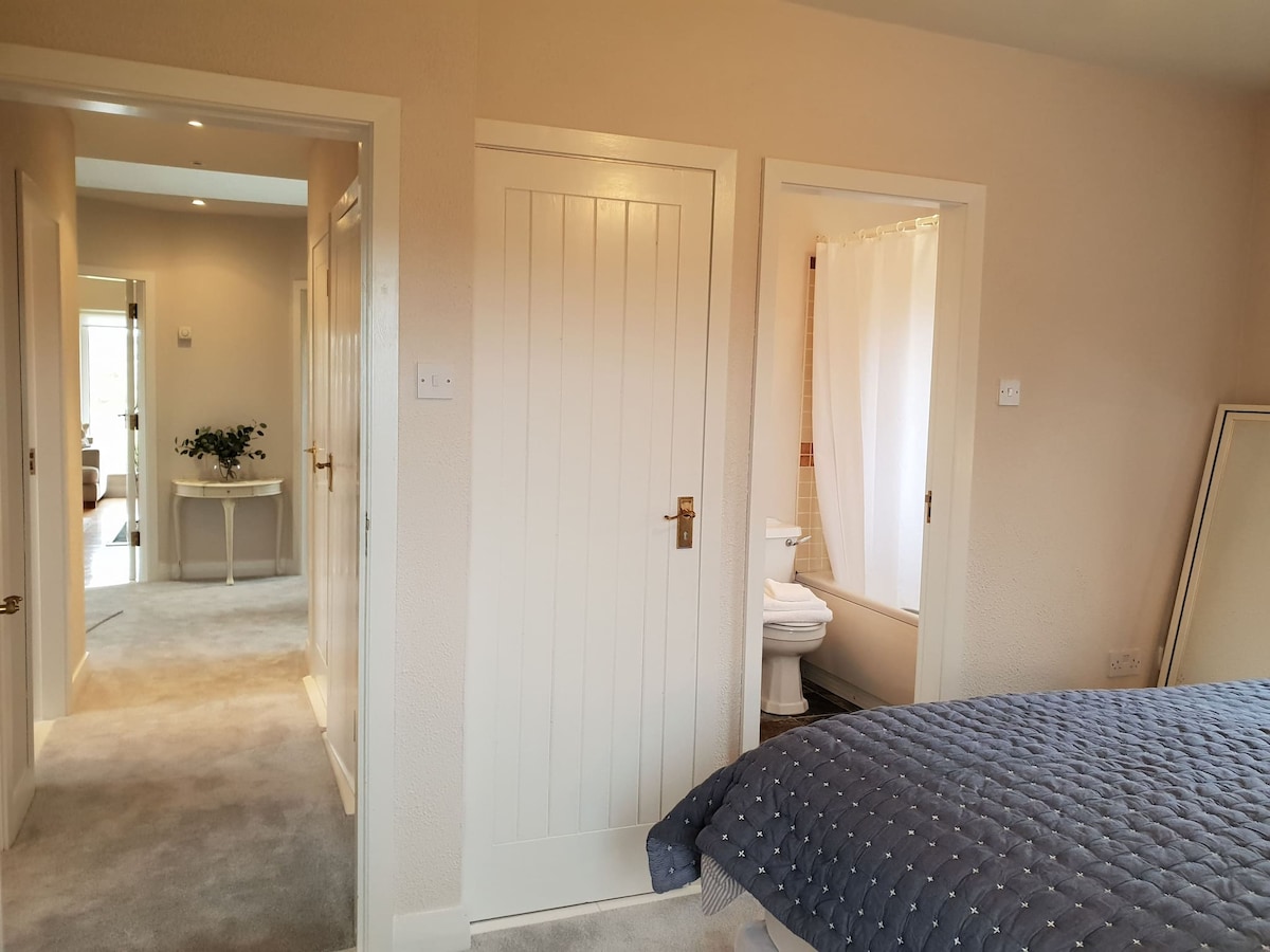 The reception area houses 2 comfy 3 x 2 seater sofas and a coffee table on wooden flooring. Opening to a bright dining area with table seating up to 6 guests, sliding doors leading to the communal gardens with fabulous countryside & lake views. The kitchen is fully equipped offering all mod cons, electric oven & hob, toaster, and coffee machine. The washing machine is housed in the shed beside the cottage.