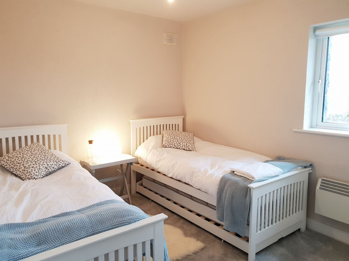 Bedroom 2: Twin bedroom offering 2 single trundle beds (pull-out single mattress underneath i. e 4 single beds – ideal for children). Window to the front of the cottage.