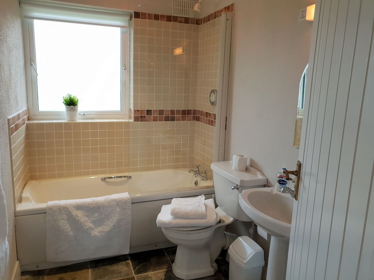 Main bathroom: Three-piece suite comprising of bath with shower overhead, Wc & sink unit.