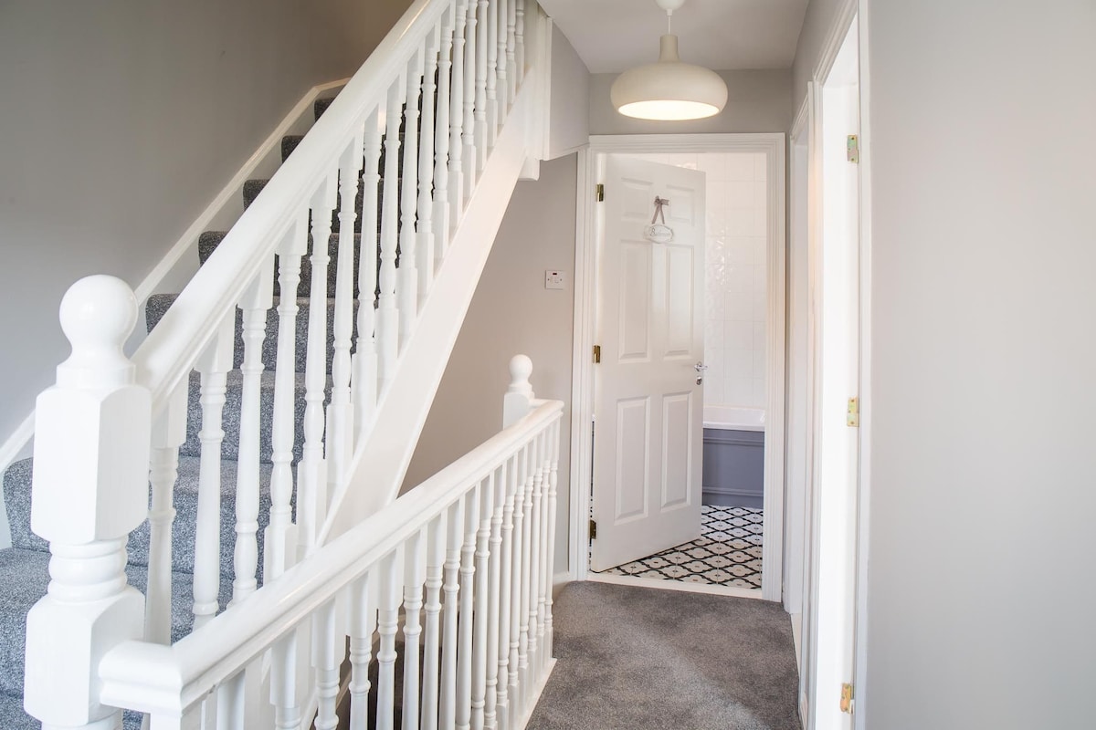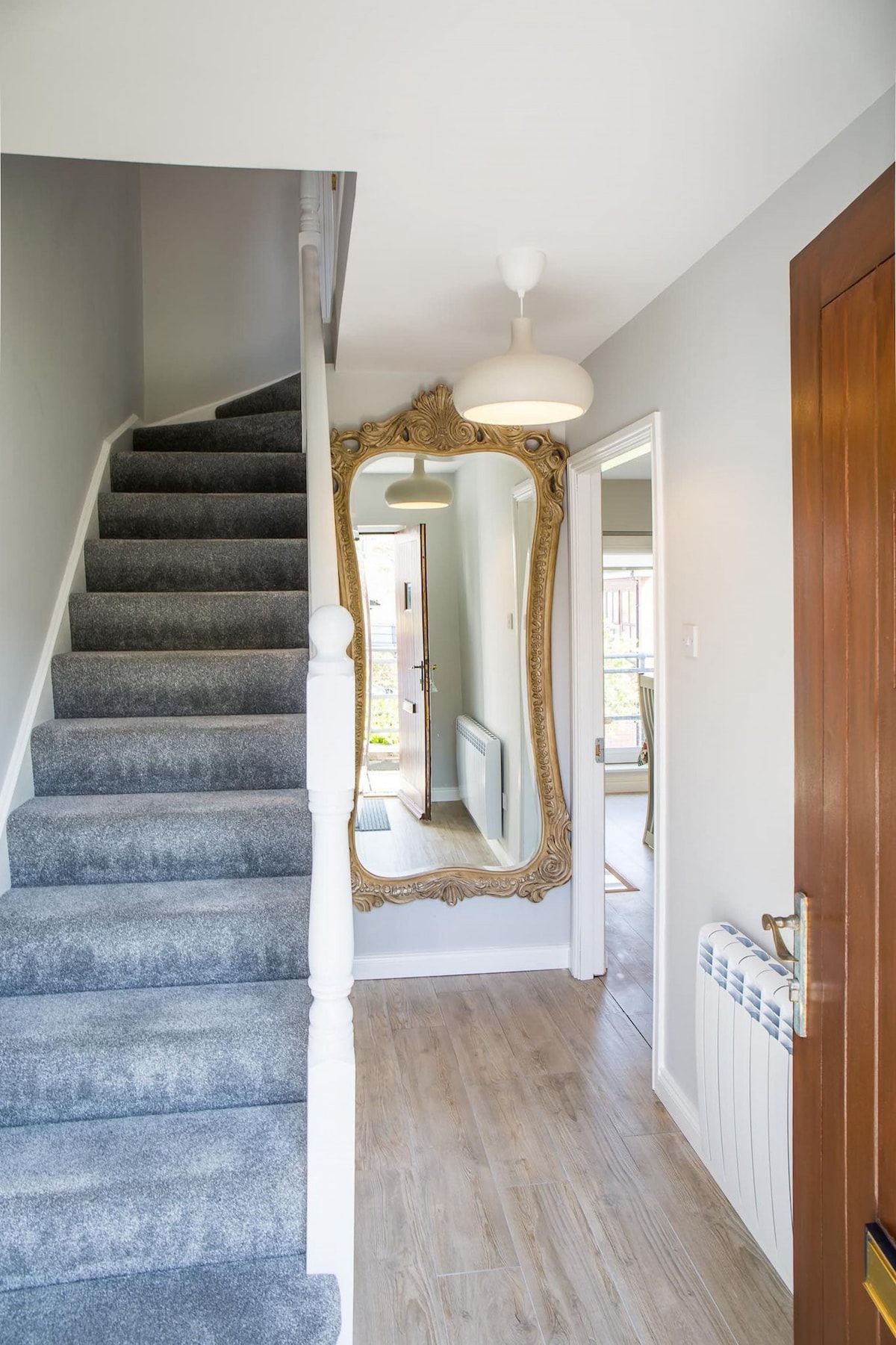 Entrance hallway with understairs storage area housing a washing machine (no dryer however we provide a clothes horse). Large floor-to-ceiling mirror. Tiled flooring, carpeted stairs leading to bedroom & shower rooms.