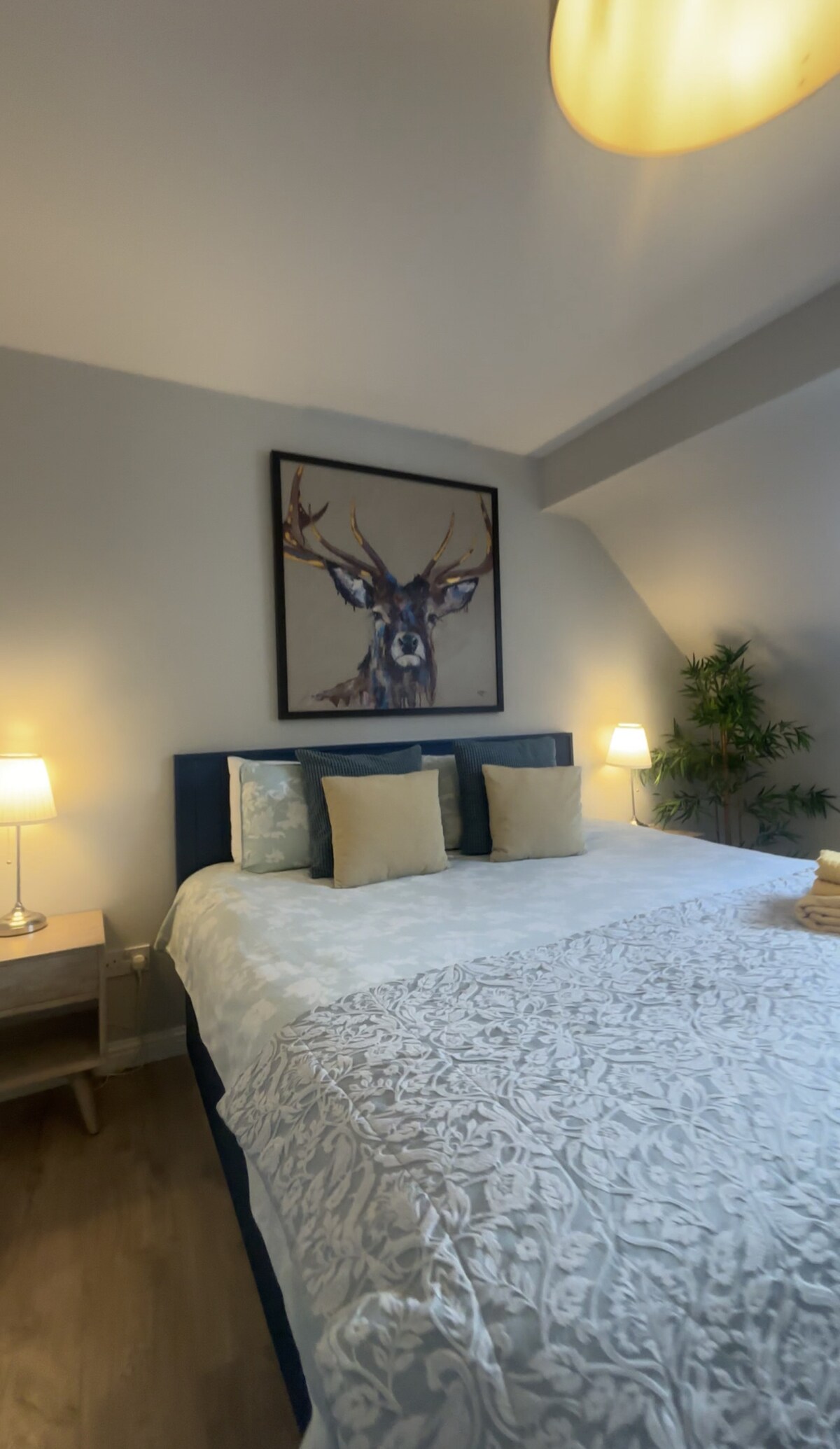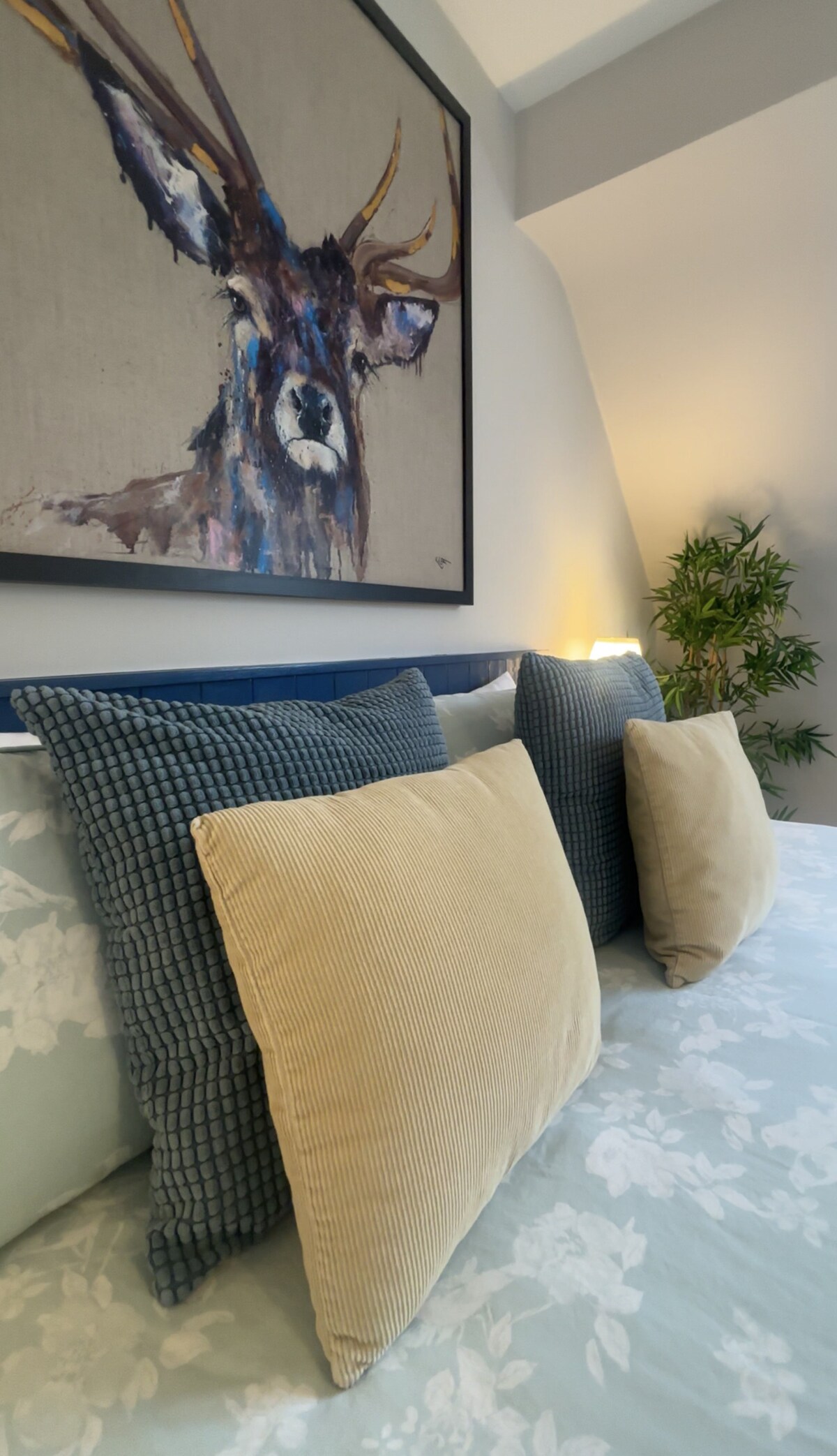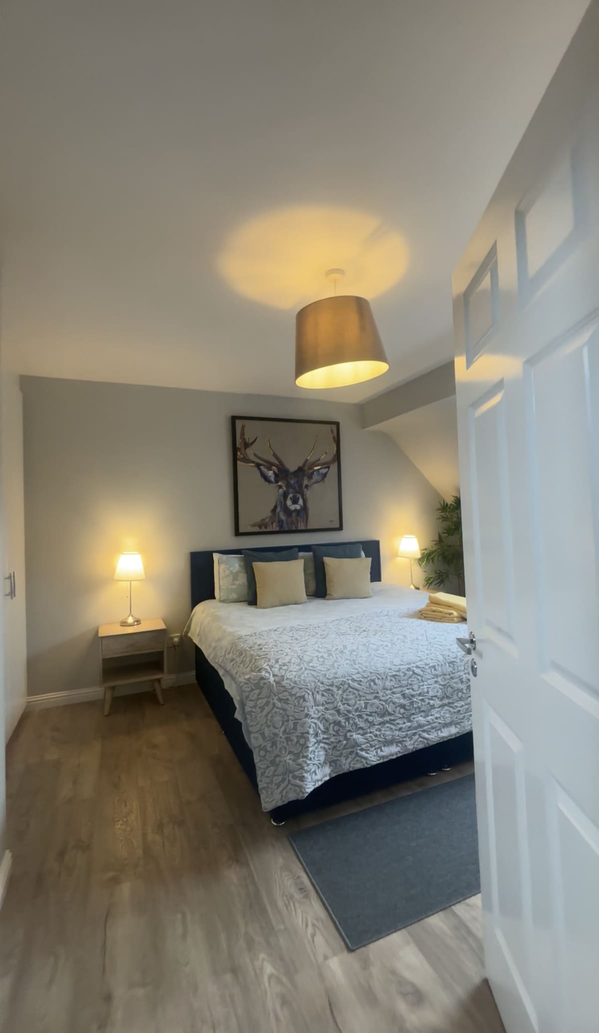 Master Bedroom, to keep things especially comfy the owner has provided a super-king size bed with an orthopaedic mattress and mattress topper, a dressing table with a large mirror and a hairdryer. There is ample storage space with fitted wardrobes and a shelf unit. Wooden flooring, Velux window with blind. SmartTV with Netflix.