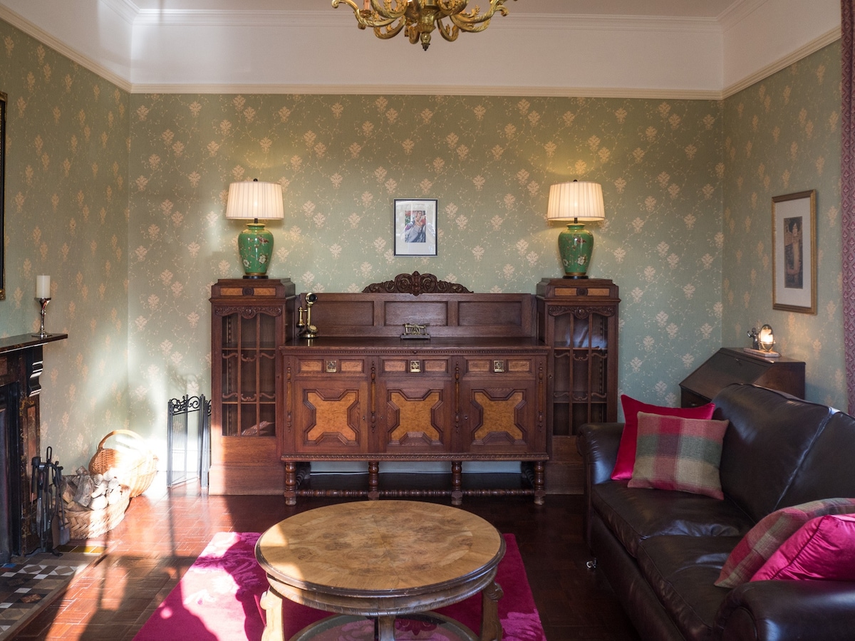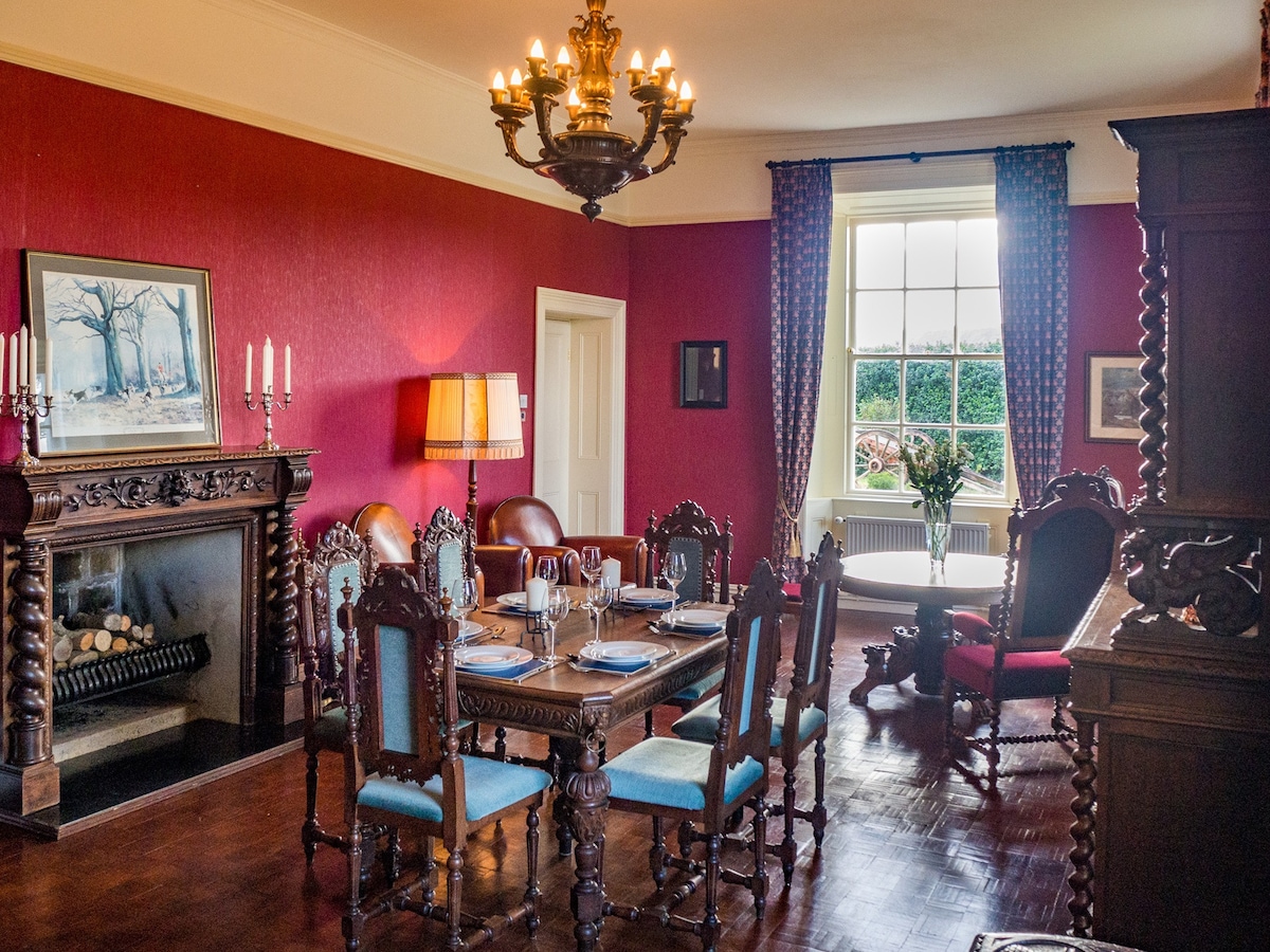 The dining room hosts a large dining table which seats up to 6 along with a smaller table seating up to 3. There is an open fireplace, ample windows allowing natural light and high ceilings. There are 2 doors leading from this large impressive room.