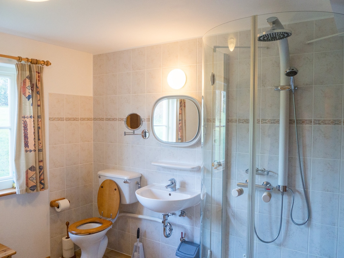 Door leading to utility/wet room with separate washing machine and drier. There is a shower unit, sink and Wc. The door leads to the back of the property.