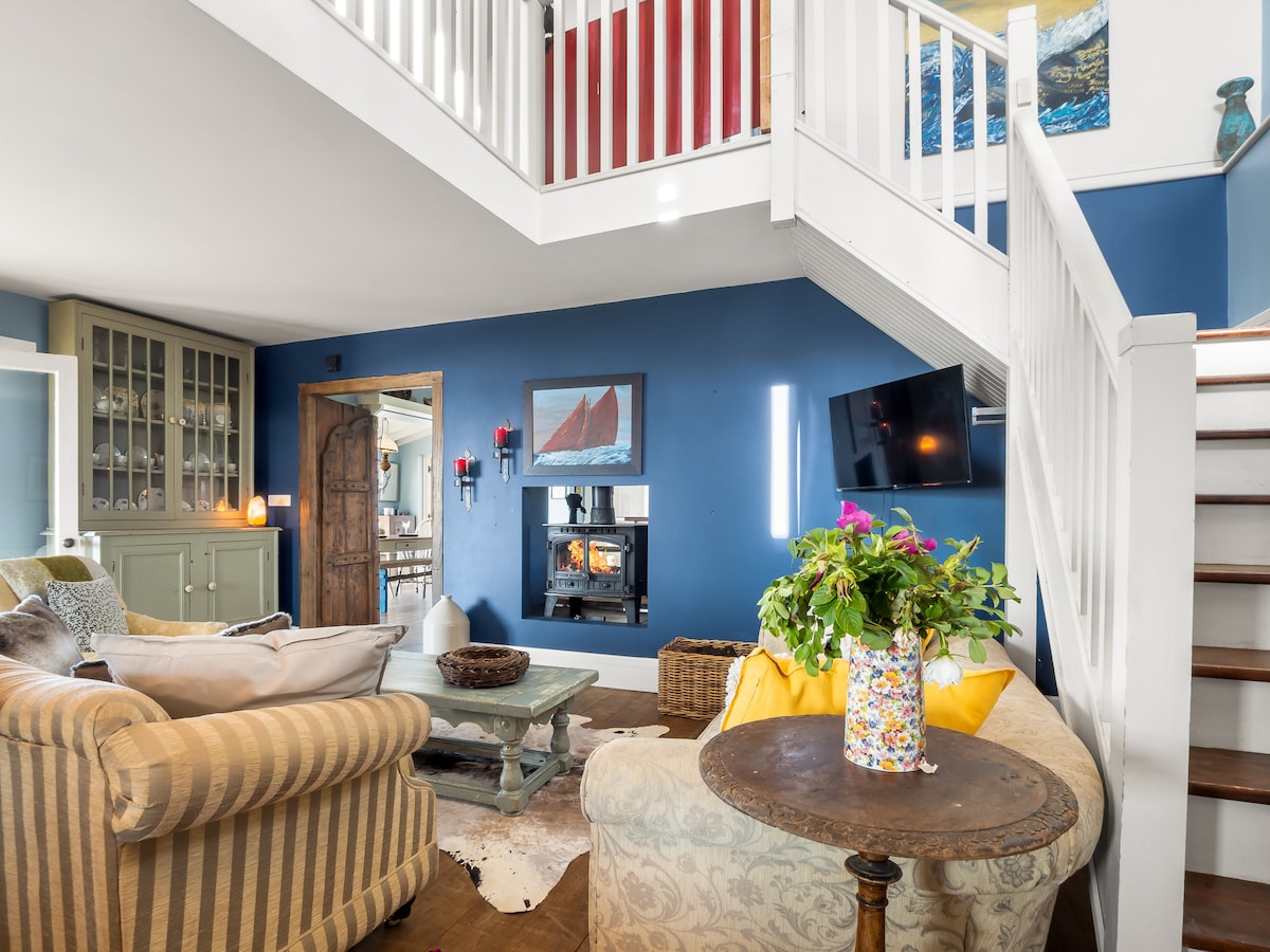 • Living Room: Cosy seating, centered around the warm glow of a double-sided stove.