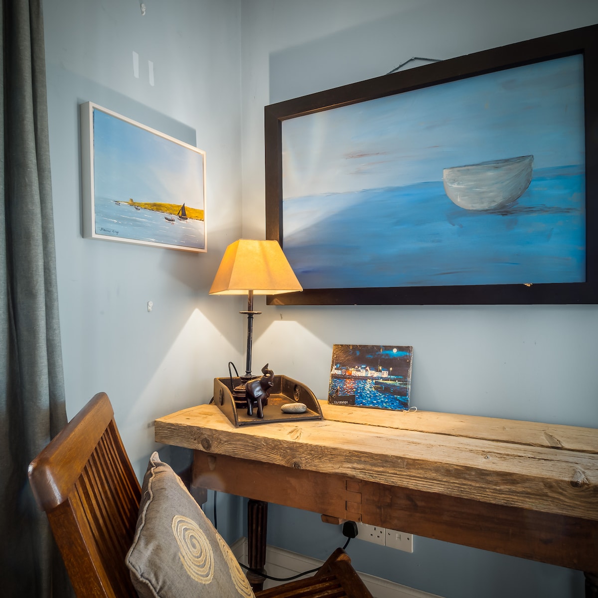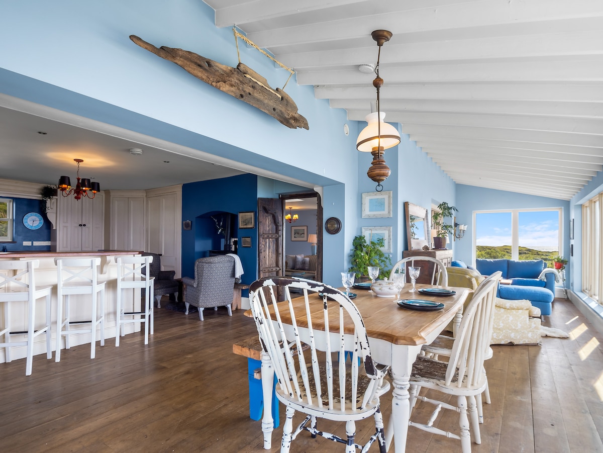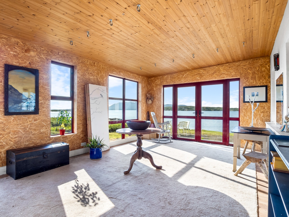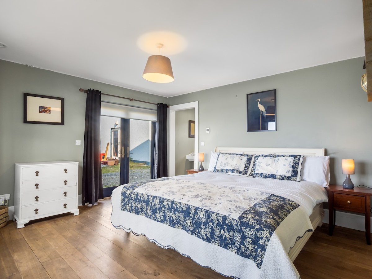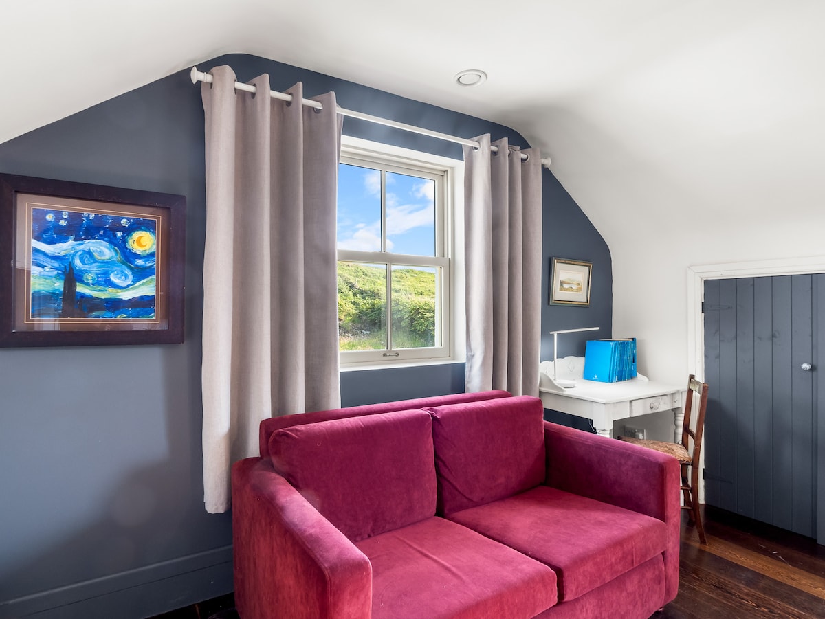 Upon entering Suantraí Cottage, the warmth of a double-sided stove welcomes you, anchoring the open-plan kitchen and dining area where culinary creativity comes to life. The kitchen is fully equipped with modern amenities, making meal preparation a pleasure. Adjacent to the kitchen, the dining area opens into a sun-soaked sunroom, providing a perfect spot for morning coffee or evening relaxation while overlooking the sea.