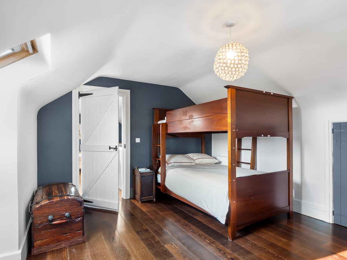 Ascending to the first floor, you are greeted by a loft seating area that provides a quiet nook for reading or enjoying the panoramic views. Bedroom 3 . is ideal for younger guests or families, equipped with a double bunk and a convenient pull-out bed. The master bedroom is a true sanctuary, featuring a queen-size bed and a standalone bath, creating a spa-like atmosphere where relaxation is inevitable.