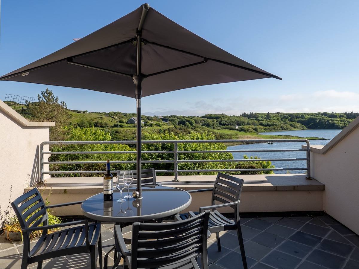 The spacious living area oozes ample natural light and offers stunning views over the Bay with ever-changing views. Smart Tv, 2 - large L-shaped Italian velvet couch (which is extremely comfortable!) and a large ottoman, perfect to relax in after a fun filled day touring Connemara.. The sliding doors lead to a large balcony area with outdoor furniture ideal for dining al fresco or to enjoy a glass of wine and watch the sunset over the Bay.