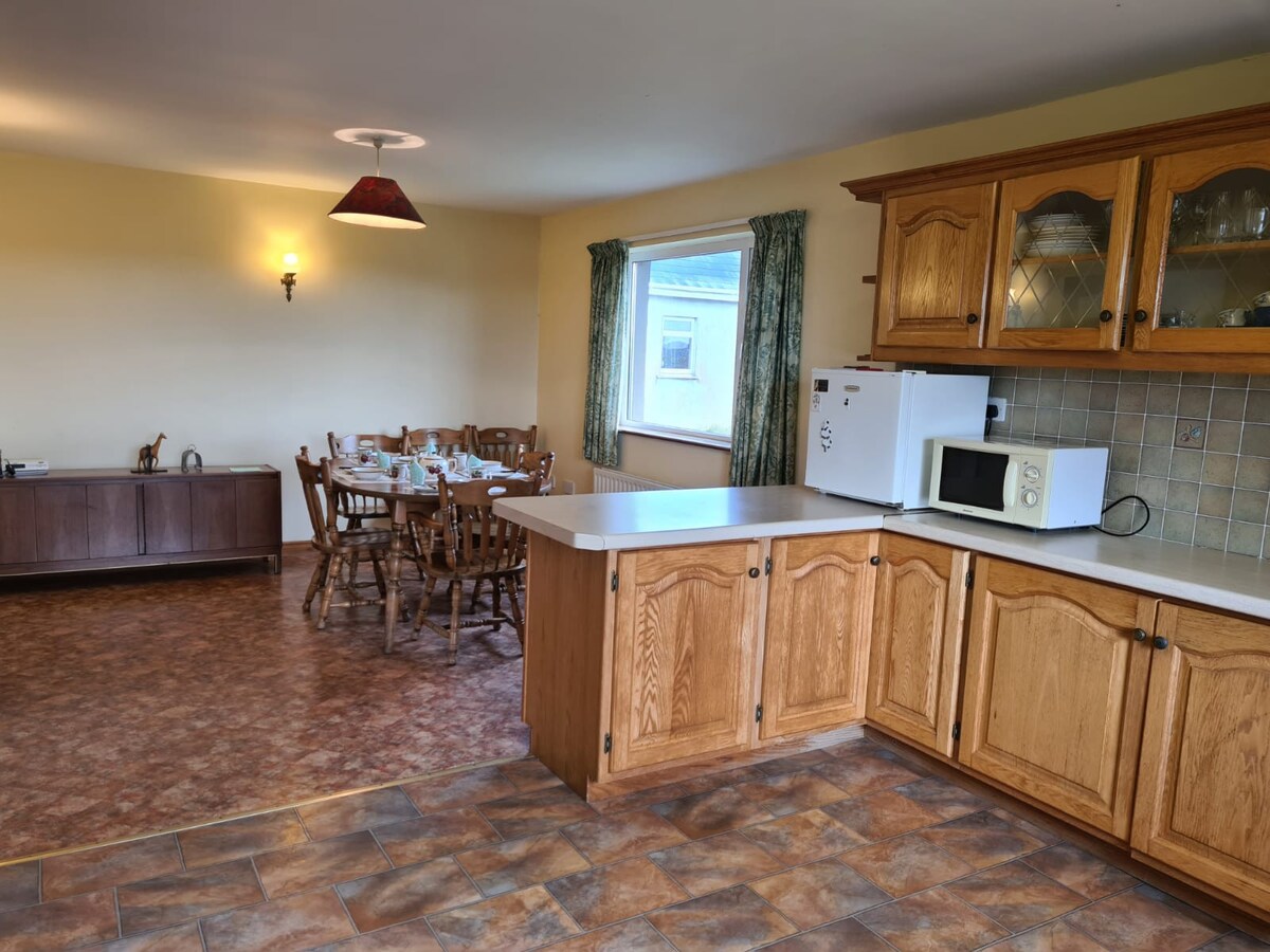 Large fitted kitchen with dining area. Bright and spacious room with 2 windows allowing ample natural light and beautiful scenic views. The kitchen houses a small fridge & separate freezer, electric oven & gas hob, toaster, kettle, microwave (please note no dishwasher). Dining table seating upto 6 guests