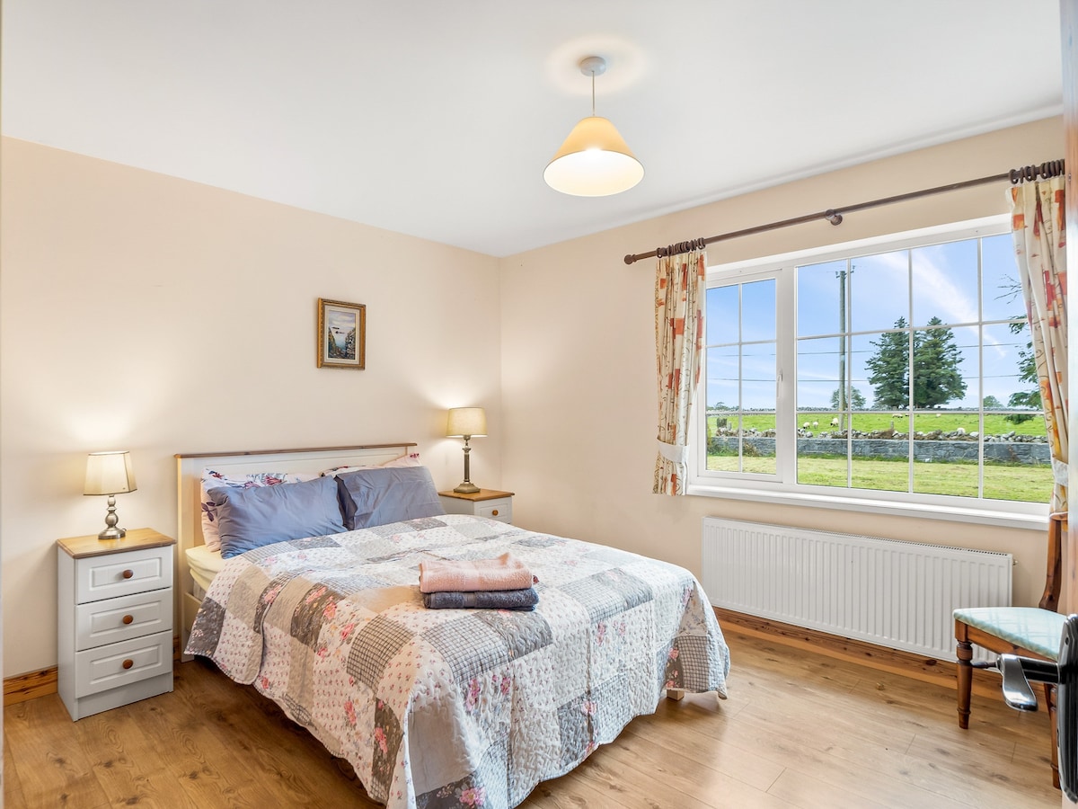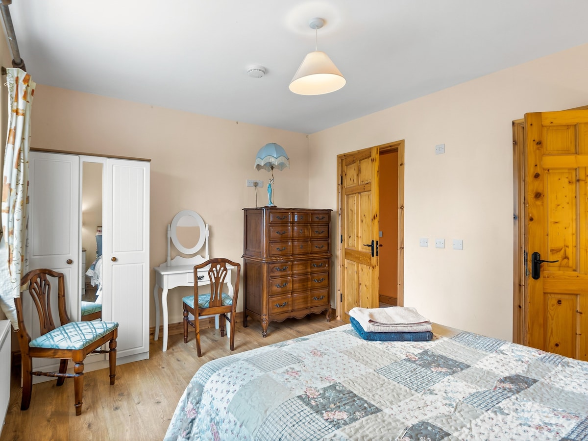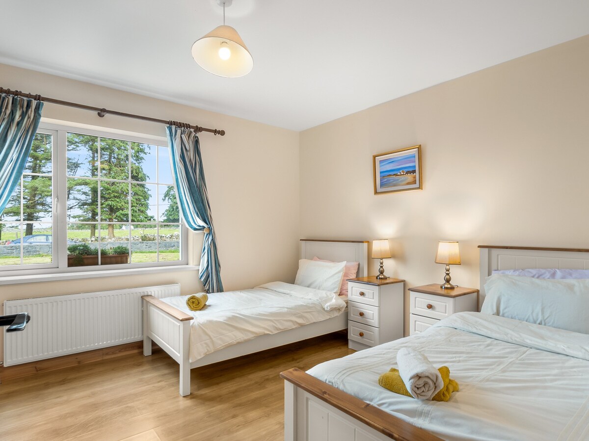 Large twin room with free standing wardrobe,wooden flooring, window to the side of house with lovely views, ensuite shower room
