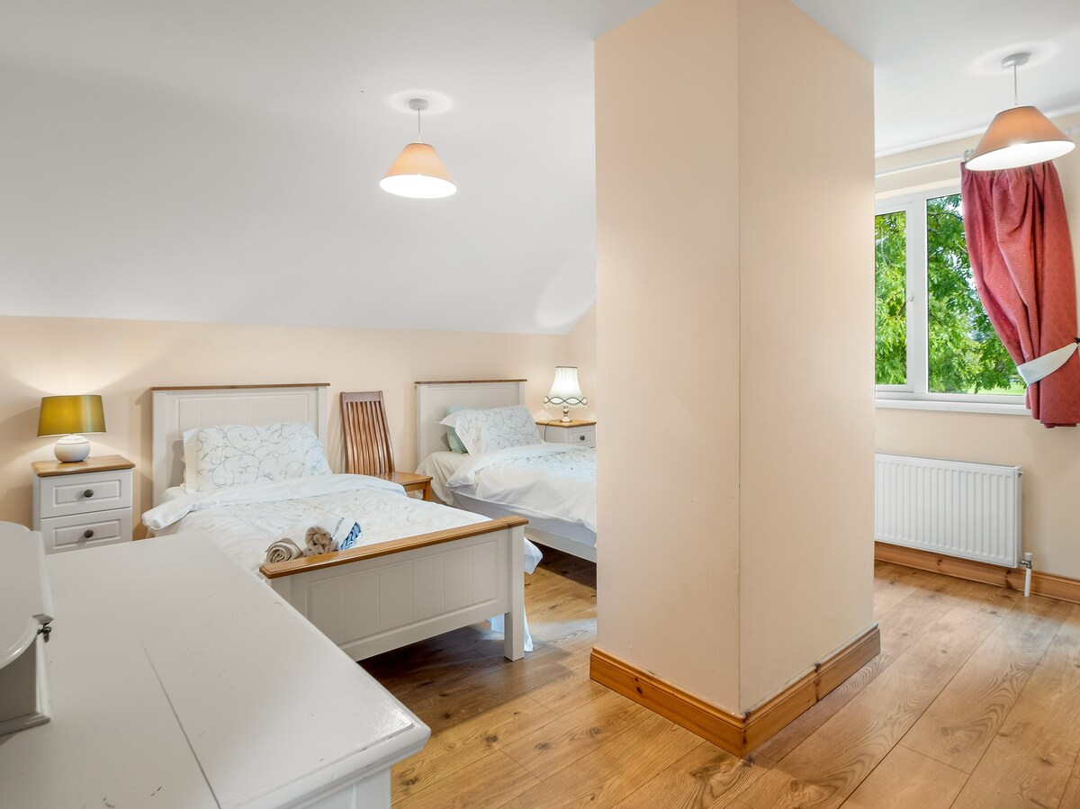 Large twin room with free standing wardrobe, wooden flooring window to side of the house with views of fields, ensuite shower room