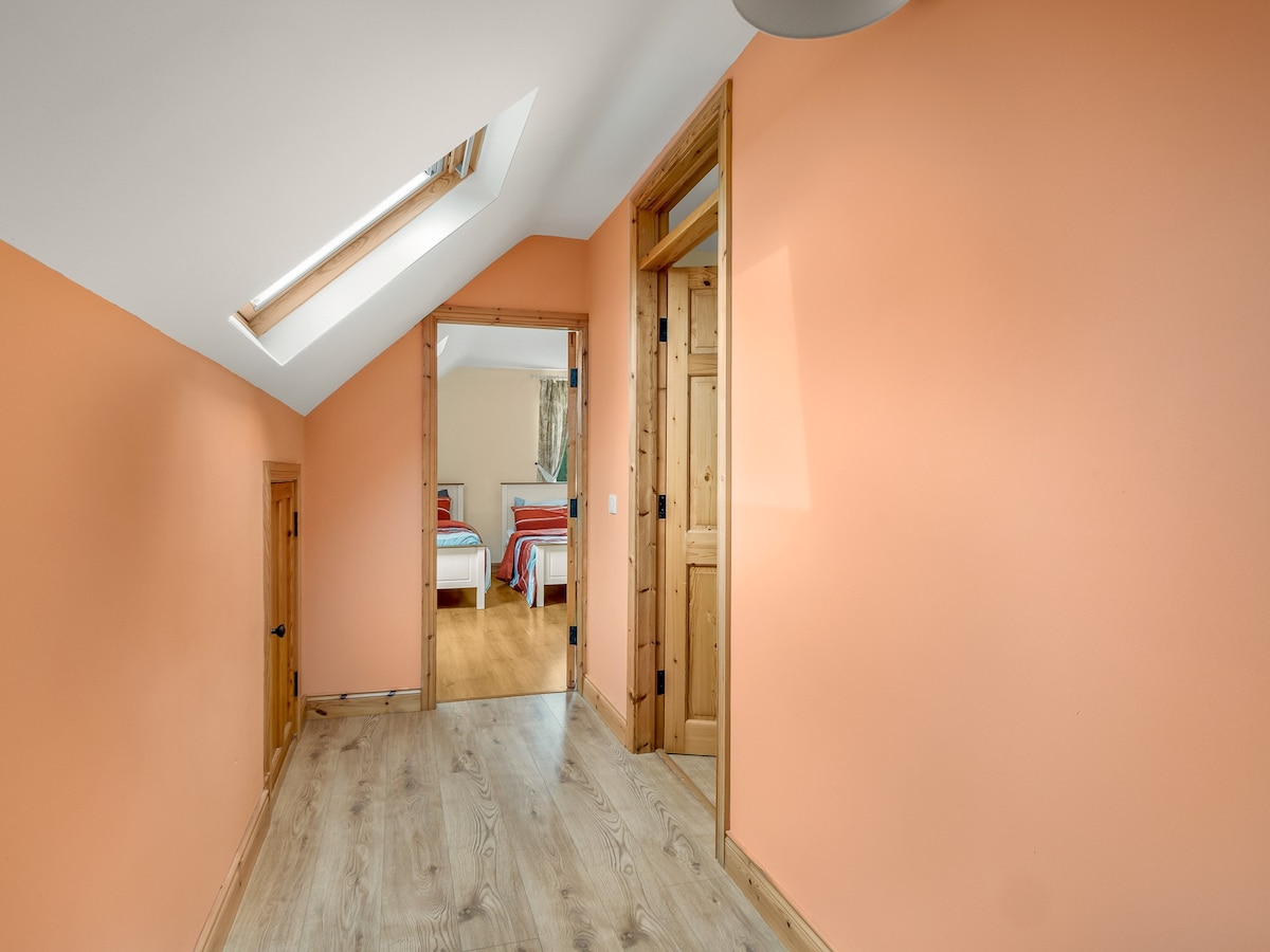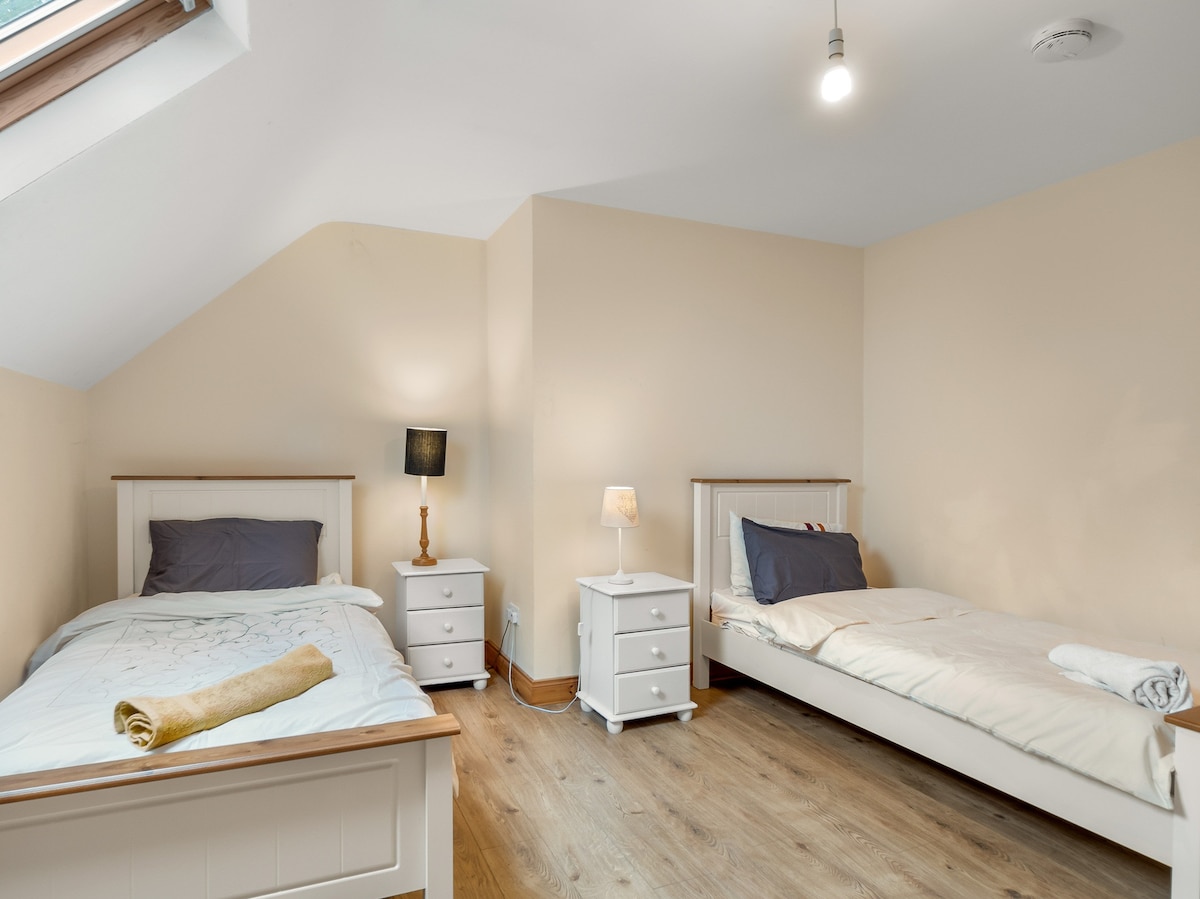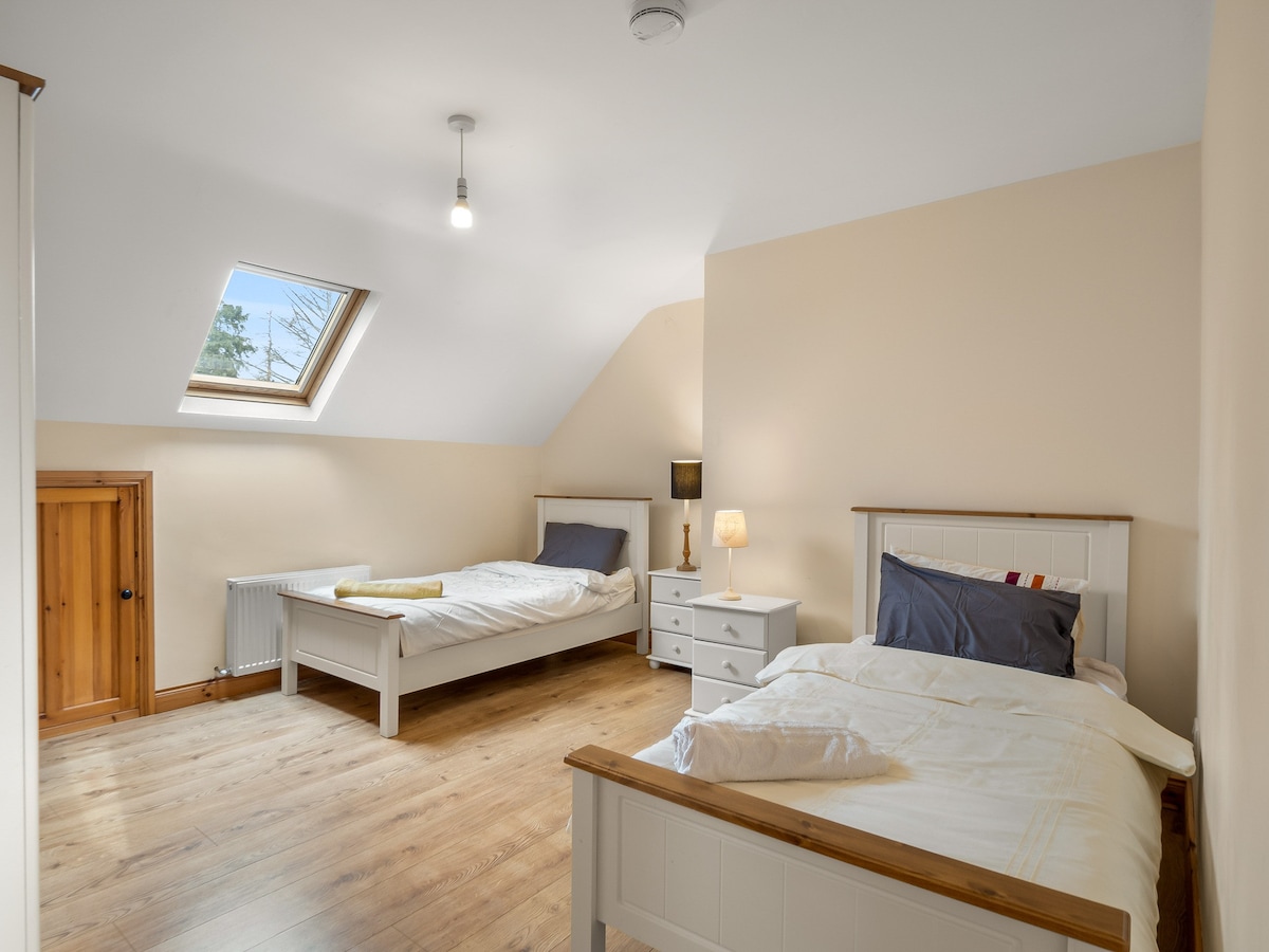Twin room with free standing wardrobe, wooden flooring, velux window and ensuite shower room
