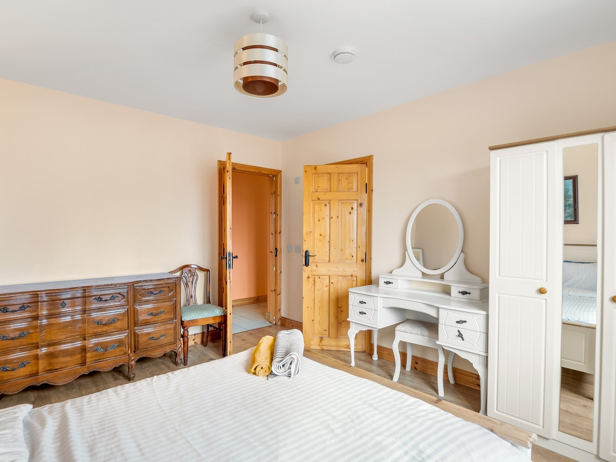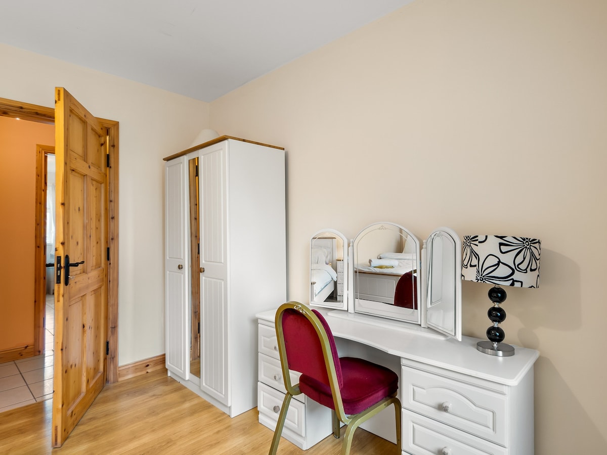 Double room with free standing wardrobe and dressing table, wooden flooring, window to front of house, ensuite shower room