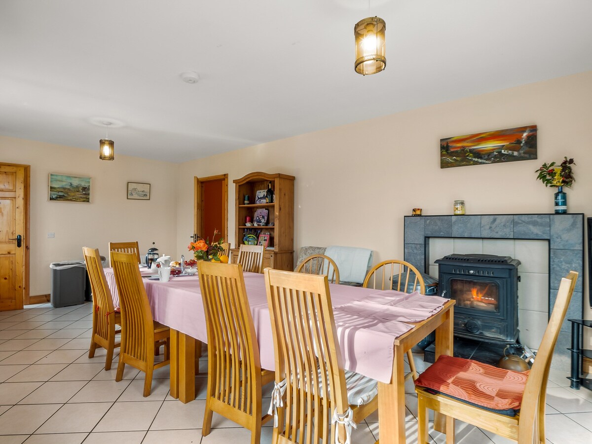 The kitchen/diner is fully equipped with a large fridge/freezer, dishwasher, electric hob and oven, large dining table, sliding doors to the side of the house, highchair and a wood burner