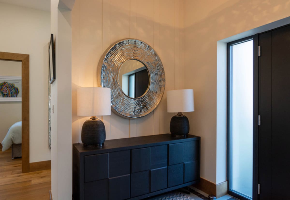 This living area is at an angled junction in the floor plan, with a main corridor back to the entrance, and an archway through to a generous and chic panelled dining room.