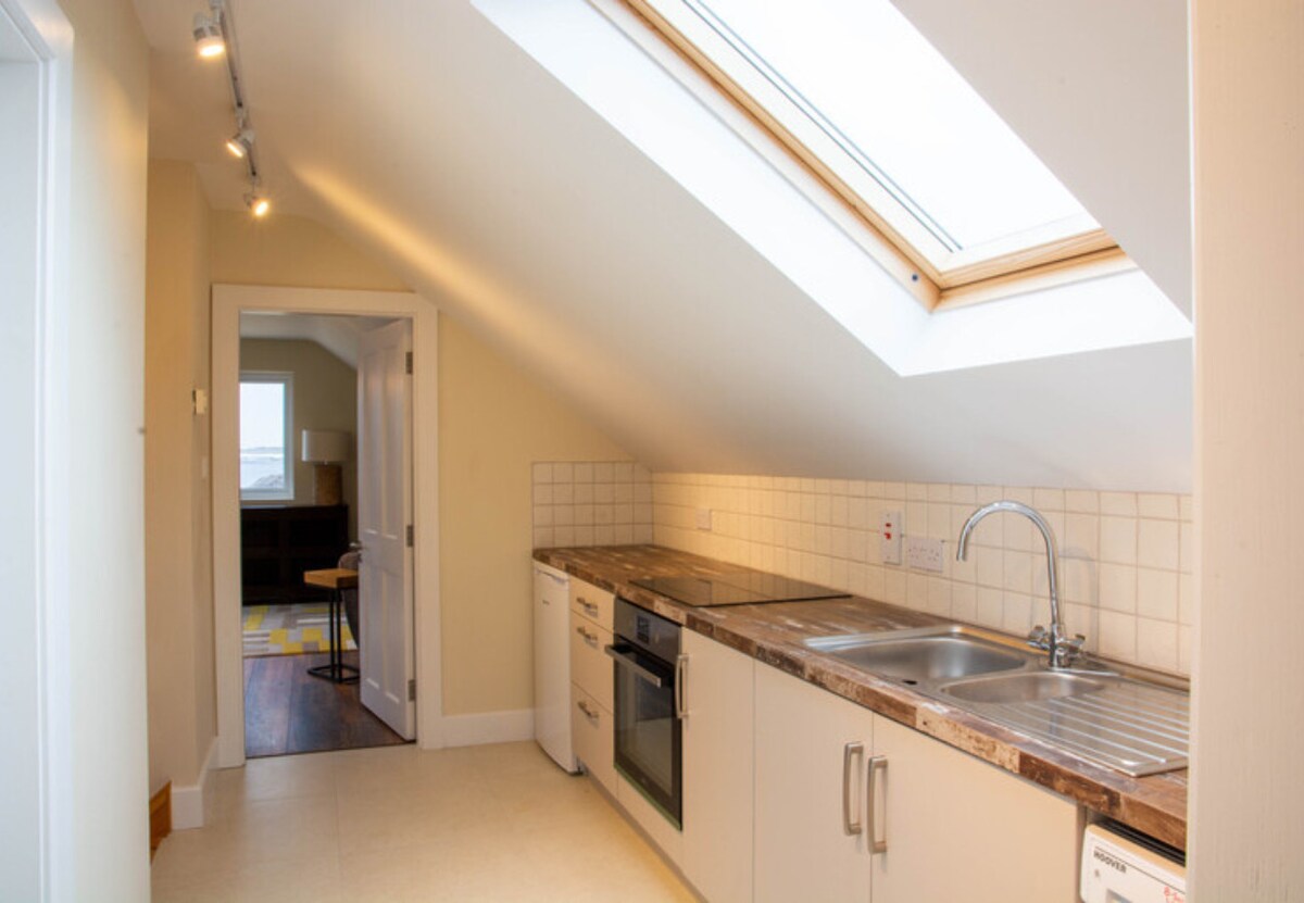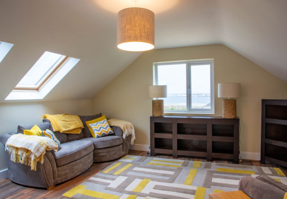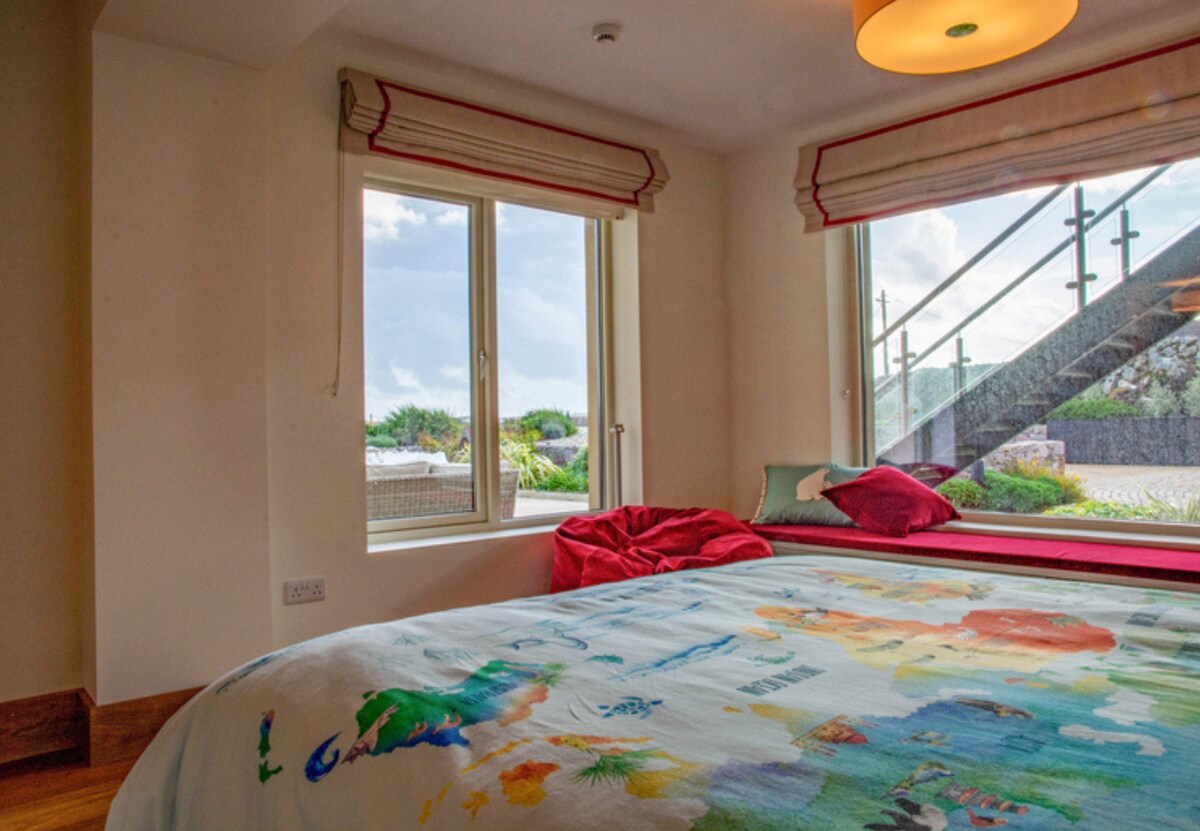 Beside it is a colourful twin bedroom, also with dual aspect views and an ensuite bathroom – kids will love it. Complete with Lego, Fuzzball table and family board games.