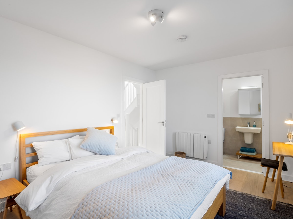 Master bedroom with awe-inspiring sea views, a double bed, desk, chest of drawers, fitted wardrobe, and wooden flooring. En-suite shower room.