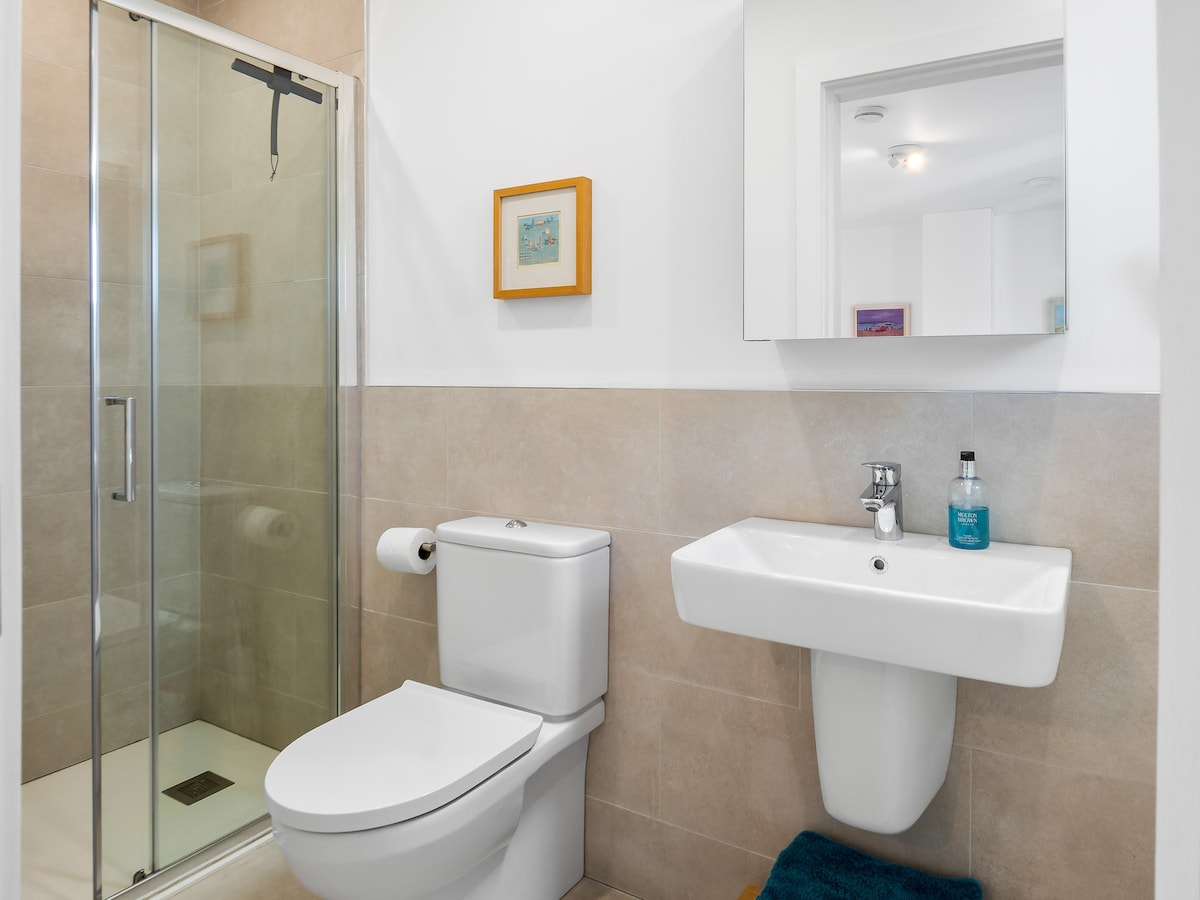 Family bathroom with a large shower unit, sink, and Wc, plus a window overlooking the front of the house.