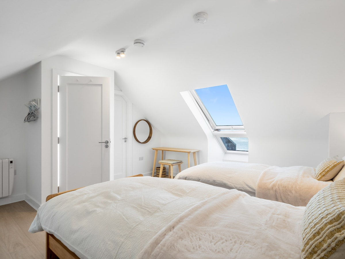 Spacious third bedroom featuring two Velux windows offering panoramic sea views, a trundle bed, a single bed, wooden flooring, and an electric heater.