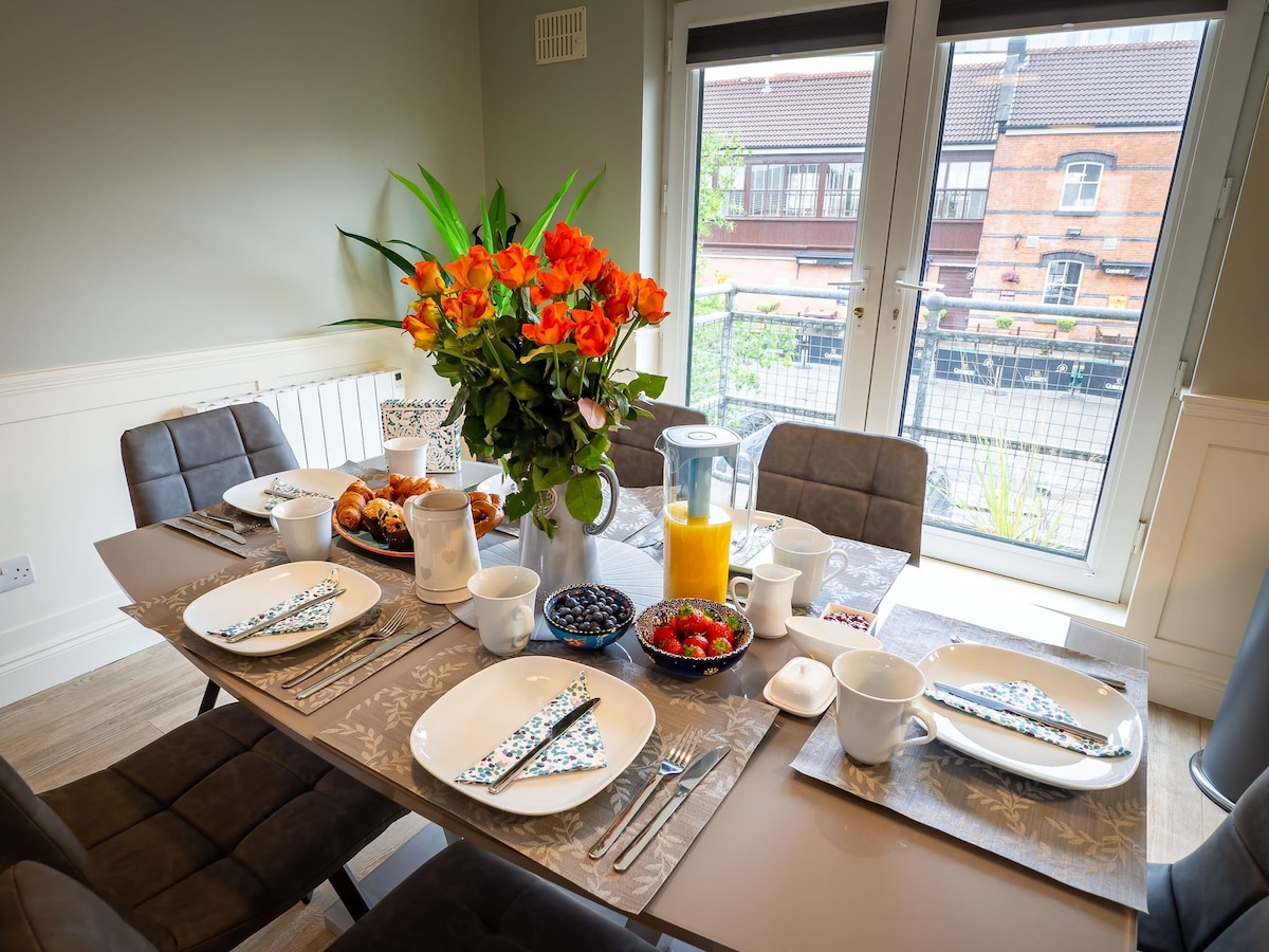 This townhouse is situated over 3 floors offering a fully equipped kitchen, with washing machine, microwave, electric oven and electric hob, window overlooking the Station House Courtyard, door leading to a bright reception room with free to air satellite TV and DVD player, 2 couches, dining table seating 6 overlooking Courtyard.Stairs leading to 2nd Floor: