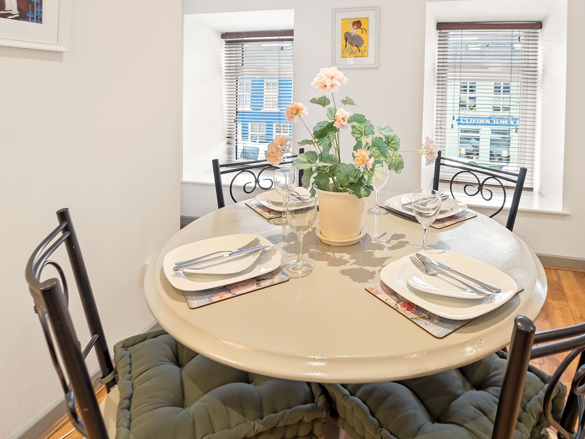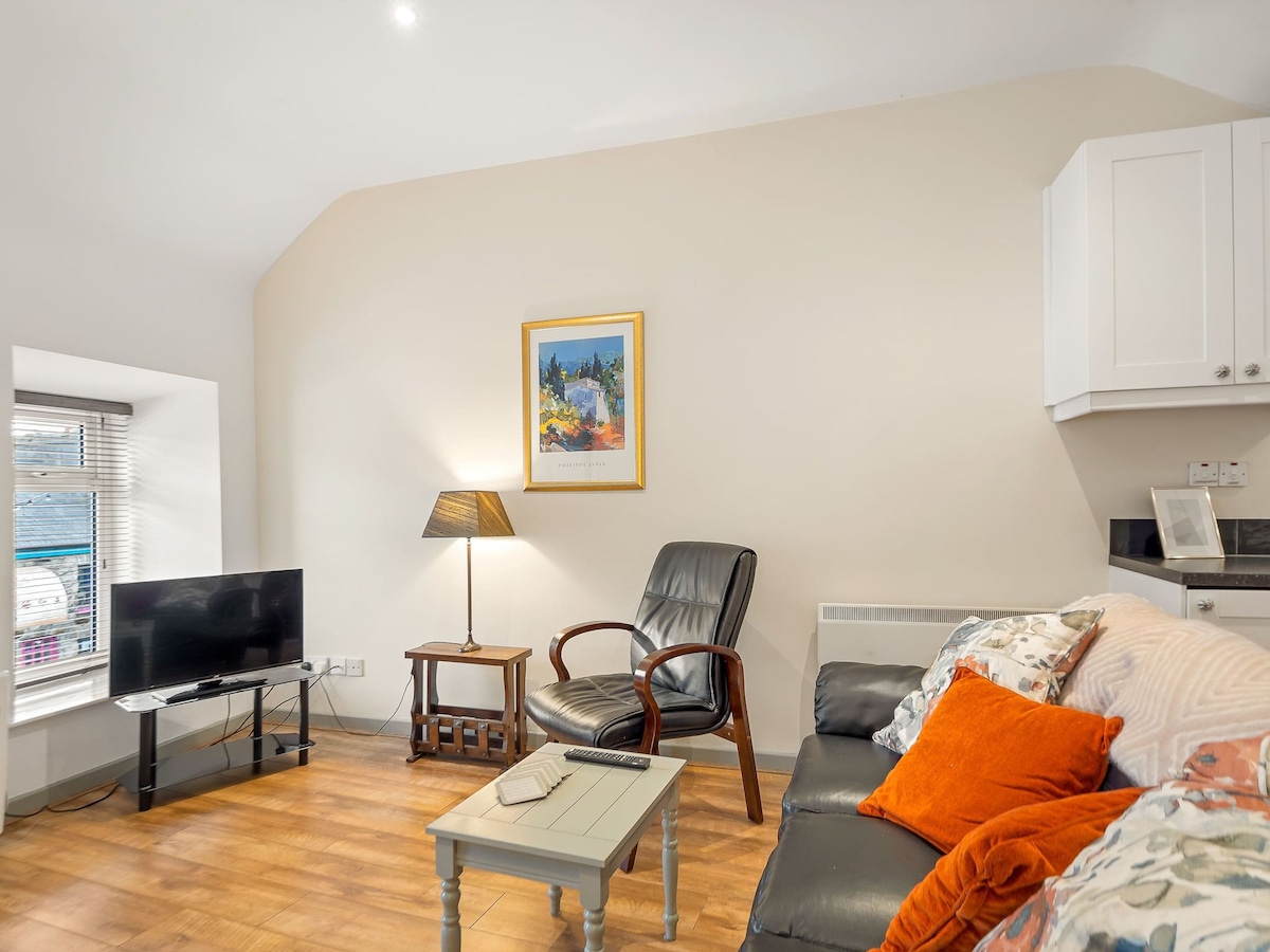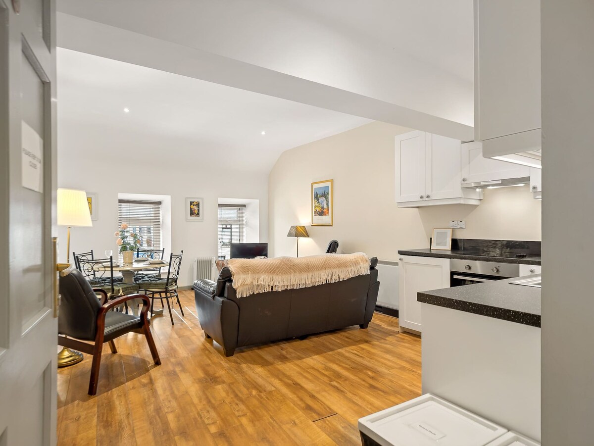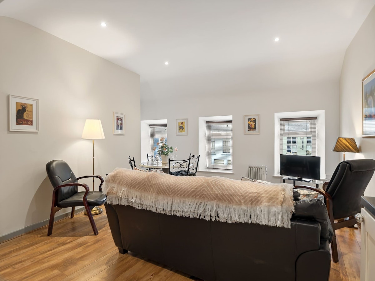 The sitting room has a 3 seater leather sofa and armchair, flat-screen Tv. There are 3 windows allowing ample natural light overlooking Market Street.