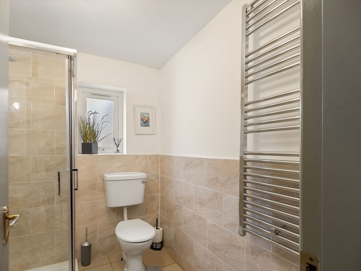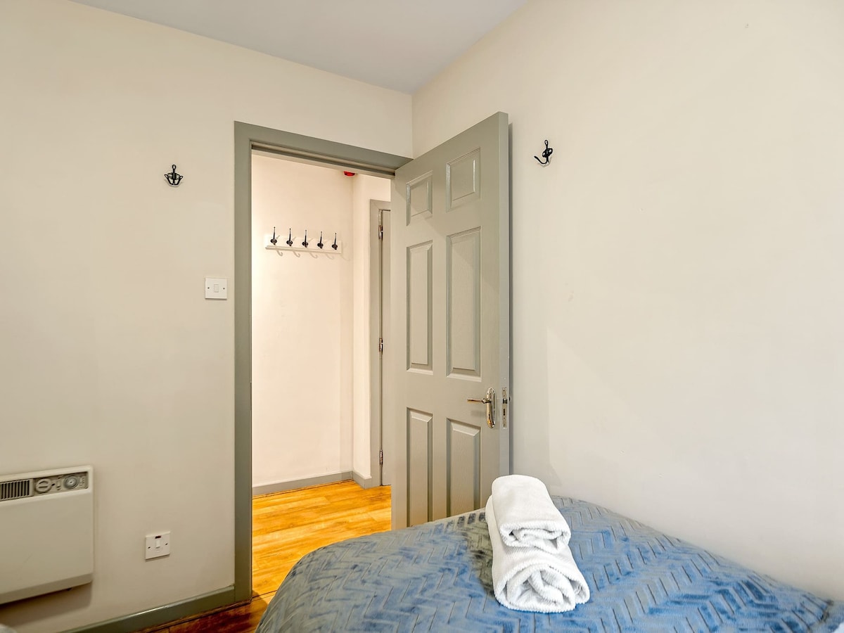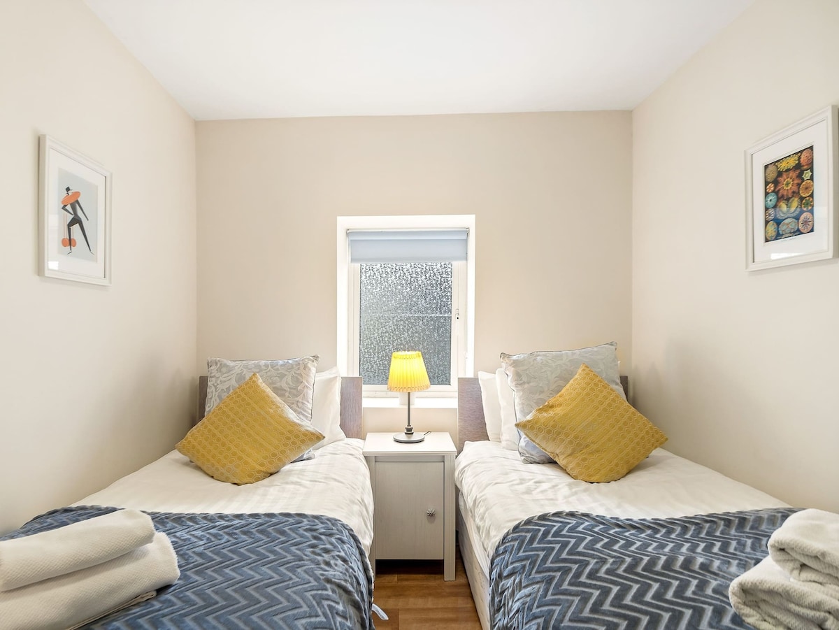 Bedroom 2: Offers 2 single beds with hanging space, frosted window to the side of the property