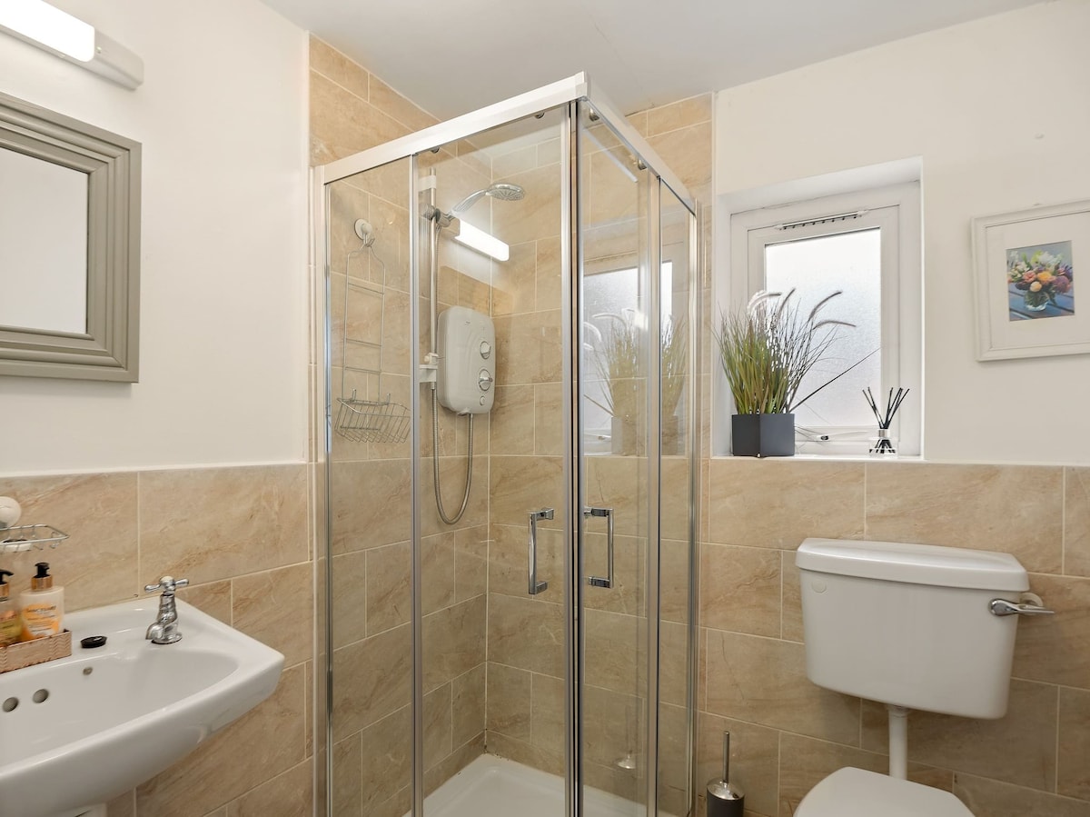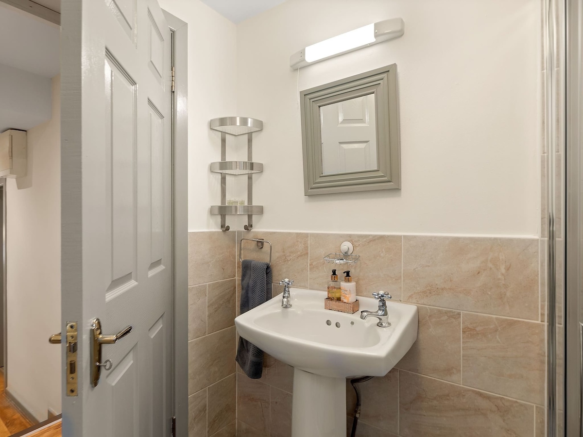 Bedroom 1: Queen (5 foot) bed with fitted wardrobe, frosted window to the back of the property.