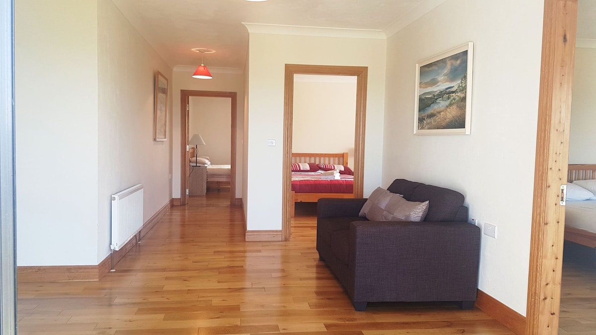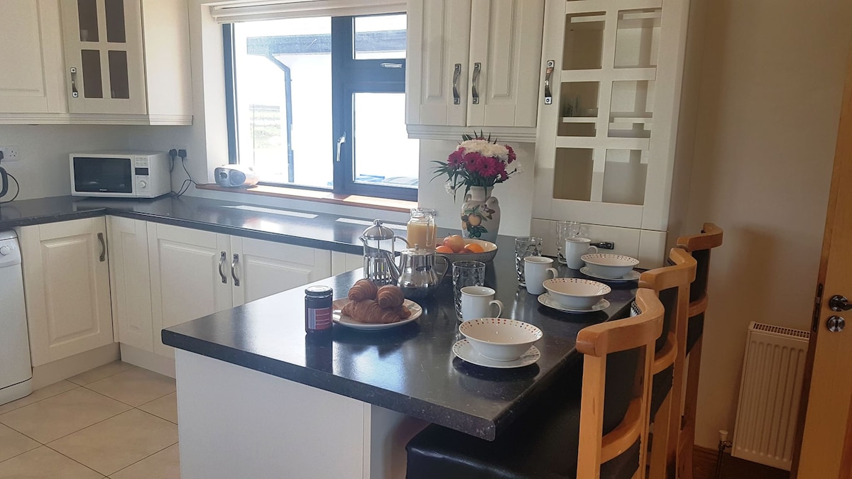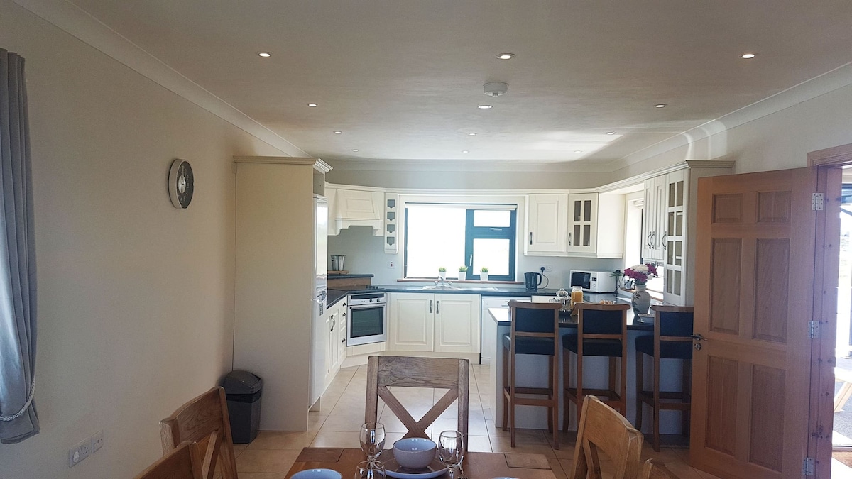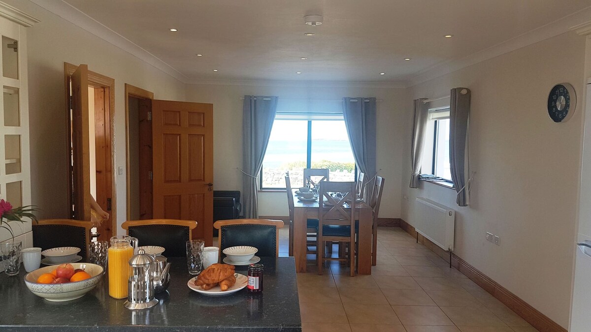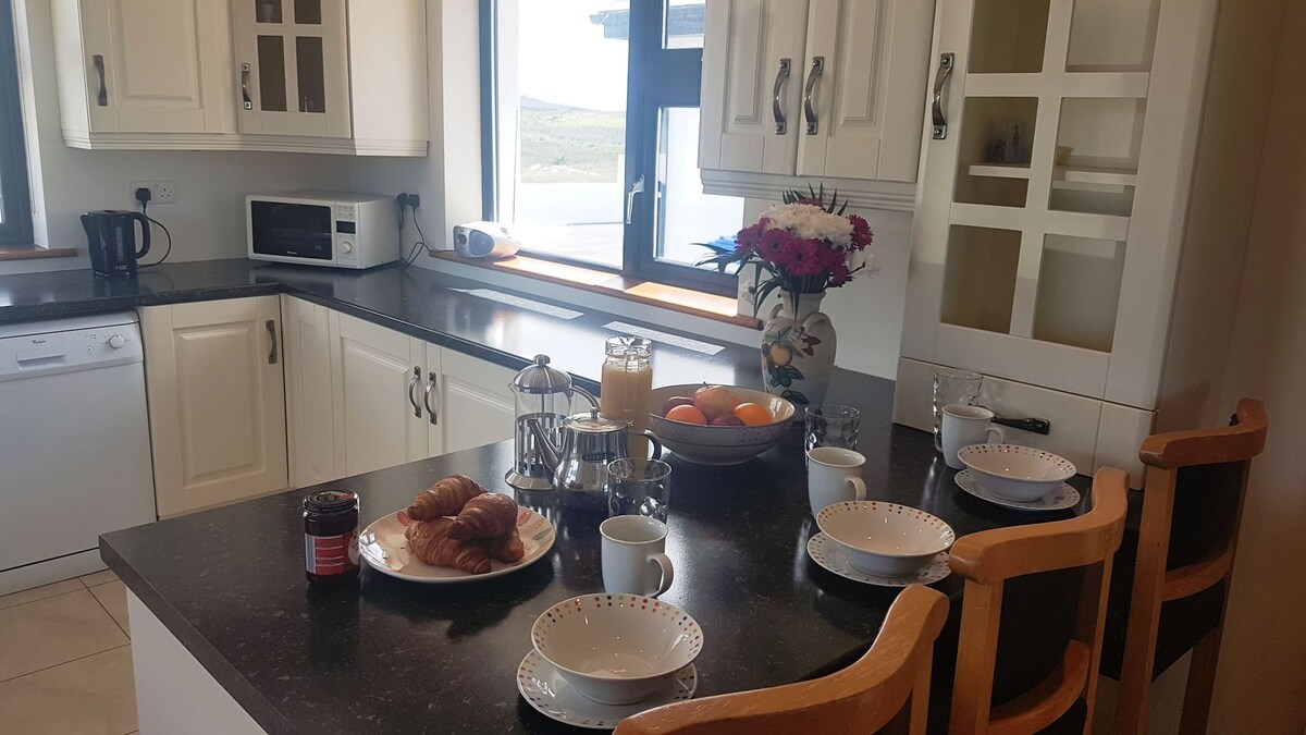 Kitchen: Fully fitted with all modern appliances including a dishwasher and microwave. Another spectacular view from this room takes in the breathtaking 12 Bens mountains. The dining area is open and planned with a large seating space for up to 6 people
