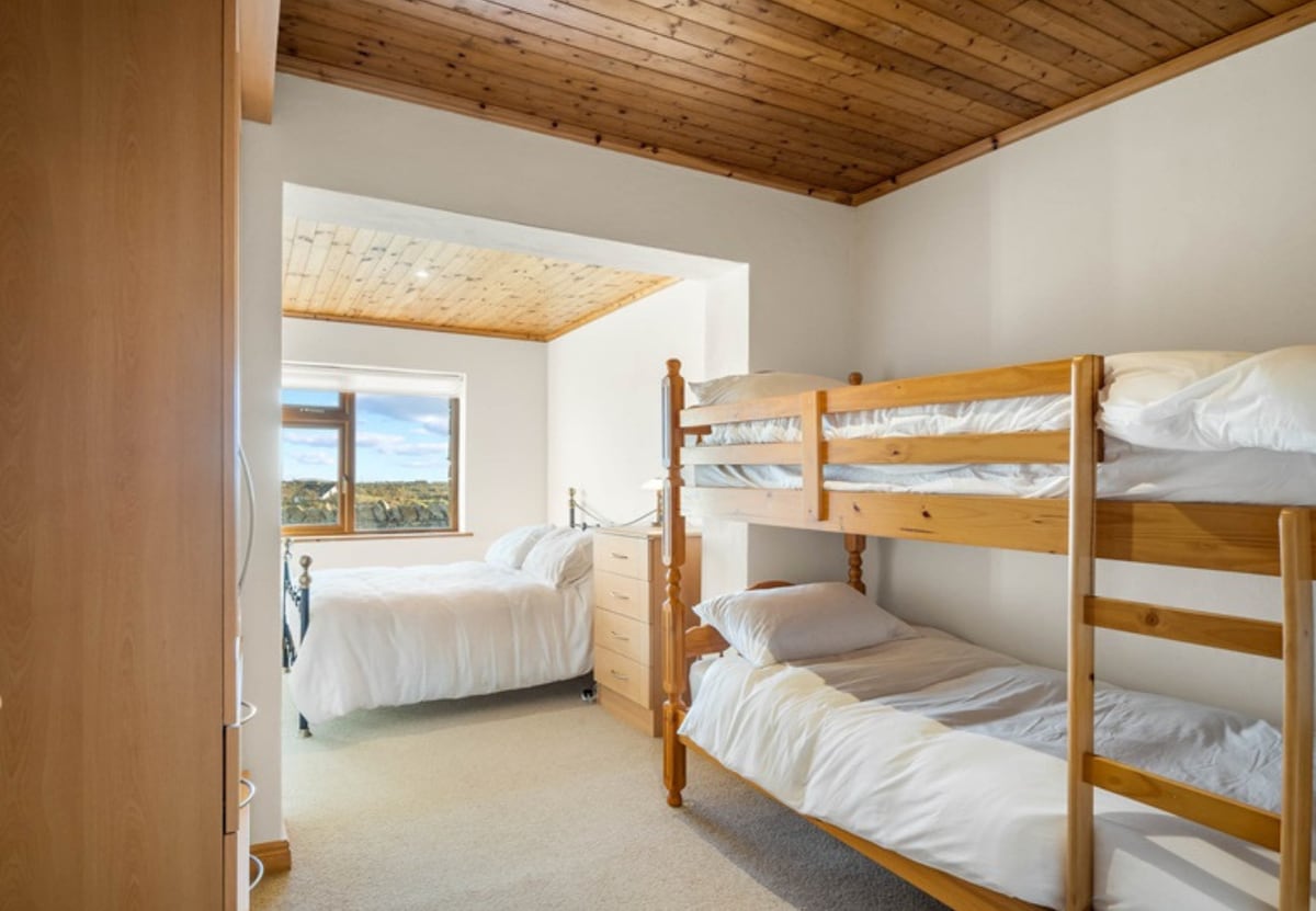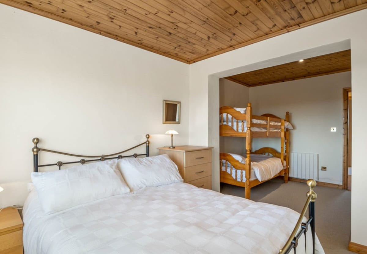 The rear bedroom has a double bed and a bunk bed sleeping up to 4 guests and has a free-standing wardrobe.