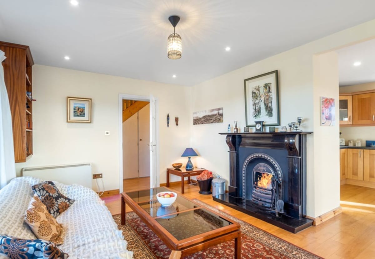 The entrance leads to a semi-open plan sitting room, kitchen, and main sitting room with a dining table. 3 bedrooms & main bathroom.