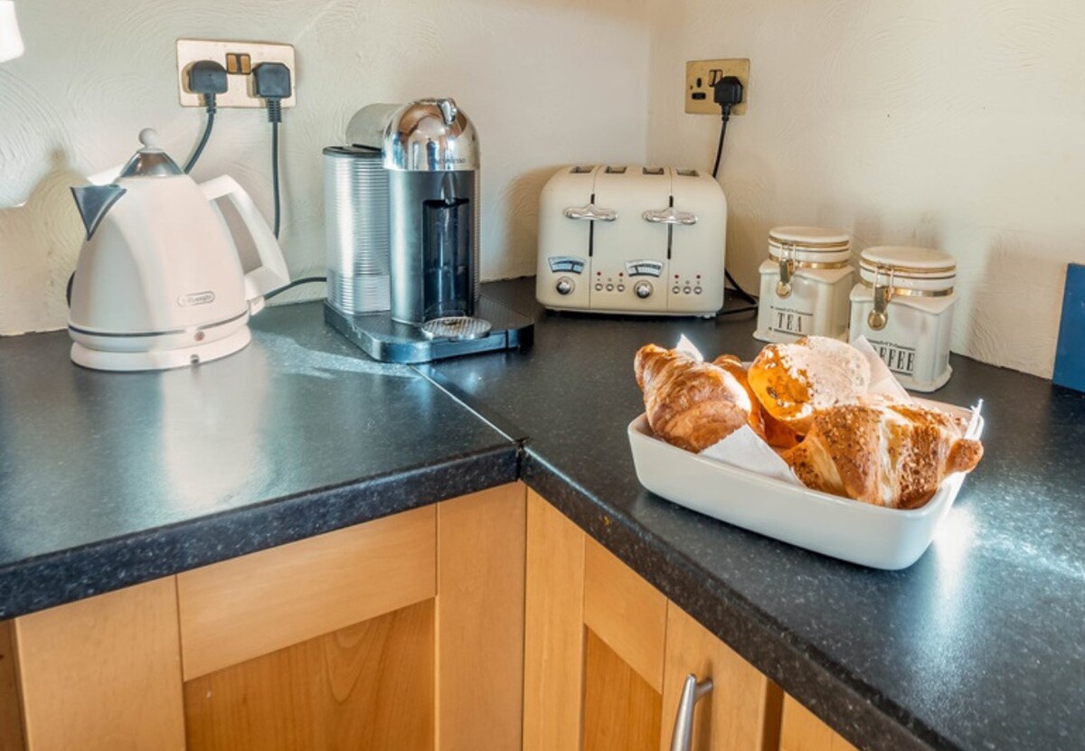 Semi-open plan kitchen with seating area, The kitchen offers all mod cons including a double oven, microwave, and Nespresso coffee maker.